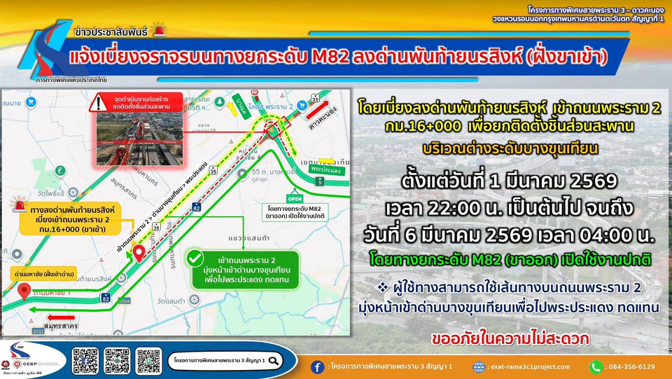 กทพ. จึงขอแจ้งเบี่ยงจราจรบนทางยกระดับ M82 (ฝั่งขาเข้าเมือง) ลงด่านพันท้ายนรสิงห์ เข้าสู่ถนนพระราม 2 บริเวณกิโลเมตรที่ 16+000 เพื่อดำเนินการยกติดตั้งชิ้นส่วนสะพานของโครงการก่อสร้างทางพิเศษ บริเวณต่างระดับบางขุนเทียน โดยจะดำเนินการตั้งแต่วันที่ 1 มีนาคม 2569 เวลา 22.00 น. เป็นต้นไป จนถึงวันที่ 6 มีนาคม 2569 เวลา 04.00 น.