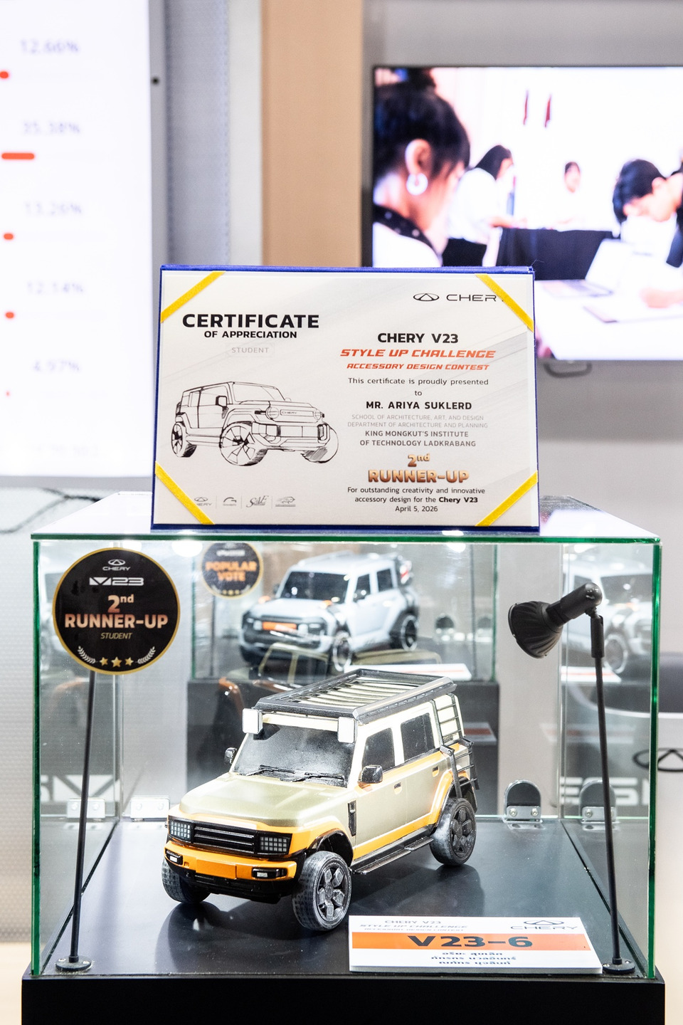 ทั้งนี้ โครงการ “Chery V23 Style Up Challenge” สะท้อนทิศทางของเชอรีที่เติบโตไปพร้อมกับความคิดสร้างสรรค์ของนักออกแบบไทย ดึงแรงบันดาลใจไปสร้างสรรค์เป็นการออกแบบ พร้อมเปลี่ยนไอเดียสู่การผลิตจริง ถือเป็นอีกหนึ่งเวทีสำคัญในการส่งเสริมศักยภาพด้านการออกแบบยานยนต์ของคนรุ่นใหม่ พร้อมต่อยอดสู่เวทีระดับสากล และสะท้อนถึงความมุ่งมั่นในการพัฒนาอุตสาหกรรมยานยนต์ไทยอย่างยั่งยืน