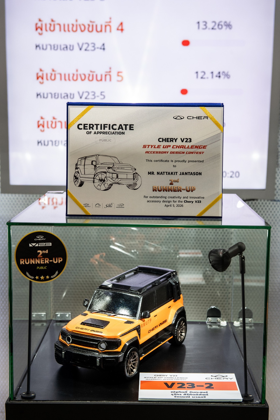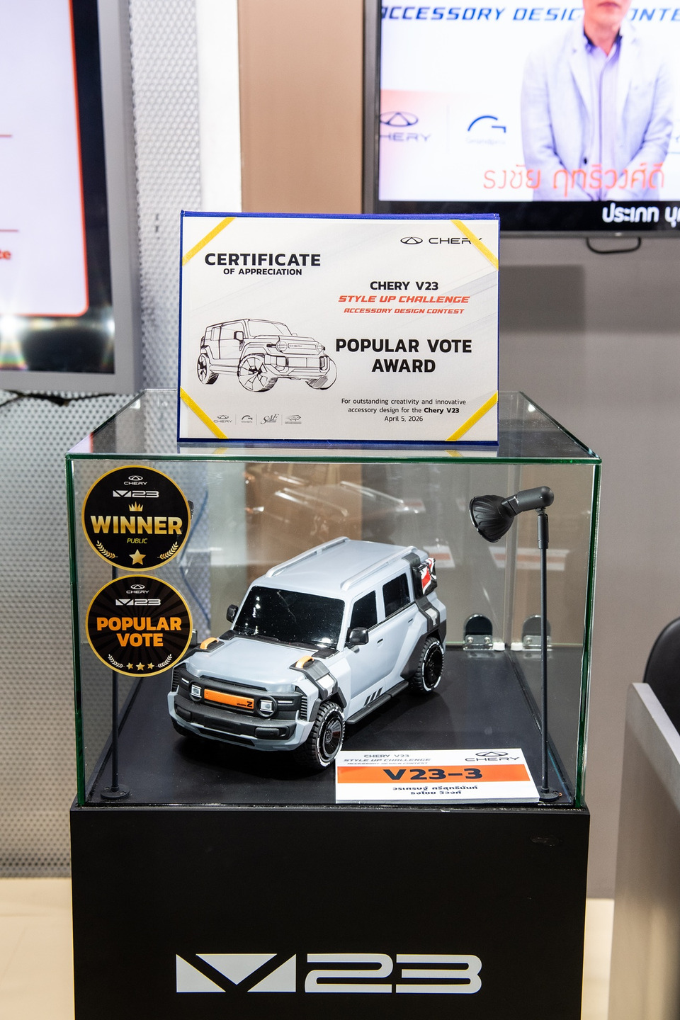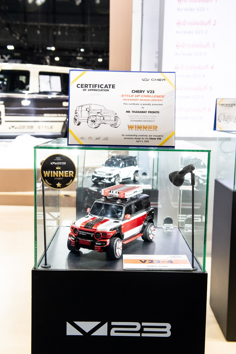 เชอรี ประเทศไทย ร่วมกับ สมาคมวิศวกรรมยานยนต์ไทย บริษัท กรังด์ปรีซ์ อินเตอร์เนชั่นแนล จำกัด (มหาชน) และสมาคมผู้สื่อข่าวรถยนต์และรถจักรยานยนต์ไทย(สรยท.) จัดพิธีมอบรางวัลโครงการประกวดออกแบบอุปกรณ์ตกแต่งรถยนต์ “Chery V23 Style Up Challenge” อย่างเป็นทางการ ณ บูธรถยนต์ CHERY ภายในงาน บางกอก อินเตอร์เนชั่นแนล มอเตอร์โชว์ ครั้งที่ 47 อาคารชาเลนเจอร์ 1–3 อิมแพ็ค เมืองทองธานี ที่ผ่านมา ท่ามกลางบรรยากาศคึกคัก โดยมีผู้บริหาร พันธมิตรในอุตสาหกรรม และสื่อมวลชนร่วมเป็นสักขีพยาน