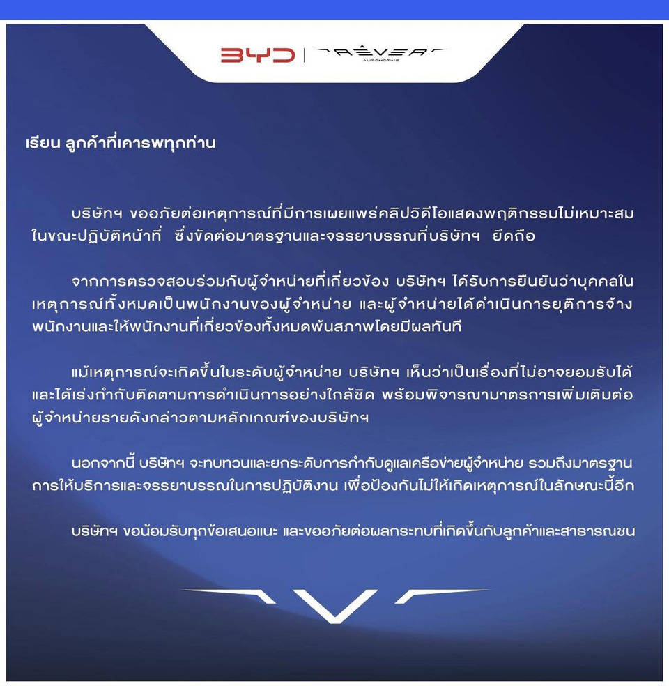 วันที่ 30 เม.ย.69 เพจเฟซบุ๊ก BYD RÊVER Thailand โพสต์ข้อความ ระบุ