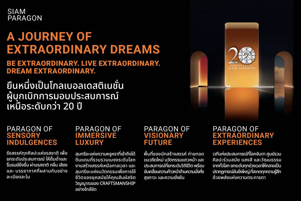 ทั้งนี้ตลอด 20 ปีที่ผ่านมา สยามพารากอนครองความเป็นที่ 1 ในใจนักท่องเที่ยวทั้งชาวไทยและต่างชาติ เป็น “The Pride of Bangkok” หรือความภาคภูมิใจของกรุงเทพมหานคร ที่เปิดต้อนรับลูกค้าทั้งชาวไทยและนักท่องเที่ยวจากทั่วโลกกว่า 100 ล้านคนต่อปี เป็นผู้บุกเบิกประสบการณ์ที่เหนือความคาดหมาย และสร้างปรากฏการณ์ที่ไม่เคยเกิดขึ้นมาก่อนในประเทศไทย ทั้งการนำเสนอร้านค้าแบรนด์ดังเป็นครั้งแรกในไทยที่มีมาอย่างต่อเนื่อง และมหกรรมอีเว้นท์ยิ่งใหญ่ระดับโลก การก้าวสู่ปีที่ 21 สยามพารากอน จึงเดินหน้าขับเคลื่อนวิสัยทัศน์ “Paragon of Extraordinary Worlds” ที่จะมอบประสบการณ์เหนือความคาดหมายให้กับลูกค้าครอบคลุมทุกมิติผ่าน 4 แกนหลัก ได้แก่