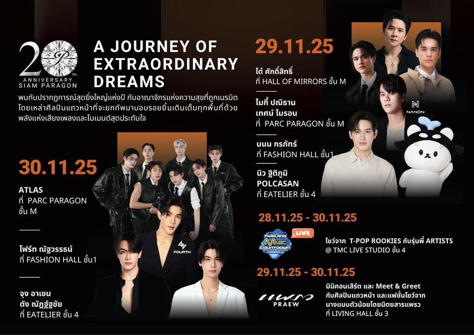 พบกับสิทธิพิเศษสุดเอ็กซ์คลูซีฟจากพันธมิตรร้านค้าชั้นนำในสยามพารากอน ที่ร่วมฉลอง 20 ปี ด้วยการมอบประสบการณ์เหนือระดับให้กับลูกค้าทุกคน ทุกไลฟ์สไตล์ พร้อมปรากฏการณ์แห่งปีที่จะมอบความสุขครั้งใหญ่ด้วยโชว์สุดพิเศษและกิจกรรมสุดเอ็กซ์คลูซีฟจากเหล่าศิลปินแถวหน้าซึ่งยกทัพมาสร้างความบันเทิงมากกว่า 70 ชีวิต ระหว่างวันที่ 29-30 พฤศจิกายน 2568