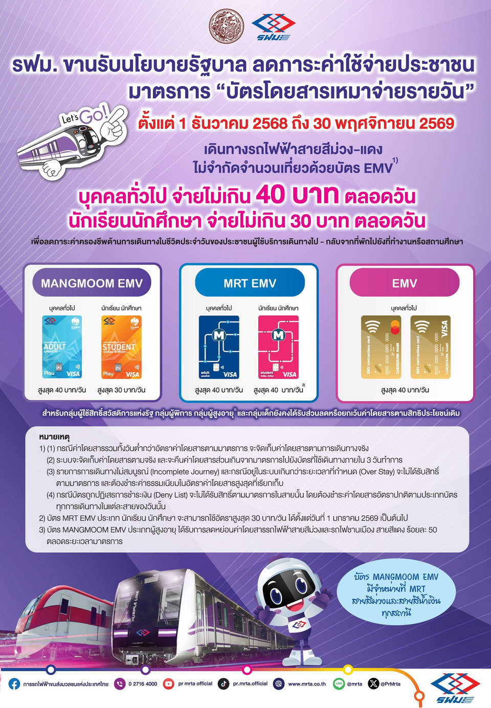 วันที่ 26 พฤศจิกายน 2568 นายกาจผจญ อุดมธรรมภักดี ผู้ว่าการการรถไฟฟ้าขนส่งมวลชนแห่งประเทศไทย (รฟม.) เผยว่า รฟม.พร้อมร่วมขับเคลื่อนนโยบายรัฐบาล “ลดภาระค่าใช้จ่ายประชาชน” โดยตั้งแต่วันที่ 1 ธันวาคม 2568 - 30 พฤศจิกายน 2569 จะดำเนินมาตรการ “บัตรโดยสารเหมาจ่ายรายวัน” สำหรับรถไฟฟ้ามหานคร สายฉลองรัชธรรม (MRT สายสีม่วง) ร่วมกับ รถไฟชานเมือง สายนครวิถี และสายธานีรัถยา (สายสีแดง) ของการรถไฟแห่งประเทศไทย (รฟท.) จัดเก็บค่าโดยสารสูงสุด 40 บาท/วัน สำหรับกลุ่มบุคคลทั่วไป และจัดเก็บ ค่าโดยสารสูงสุด 30 บาท/วัน สำหรับกลุ่มนักเรียน/นักศึกษา ซึ่งใช้บัตร MANGMOOM EMV บัตร MRT EMV หรือ บัตร EMV Contactless (บัตรเครดิต บัตรเดบิต) ใบเดียวกัน เดินทางในช่วงรถไฟฟ้าเปิดให้บริการถึงปิดให้บริการ หากอัตราค่าโดยสารรวมทั้งวันต่ำกว่าค่าโดยสารสูงสุดตามมาตรการจะจัดเก็บตามจริง