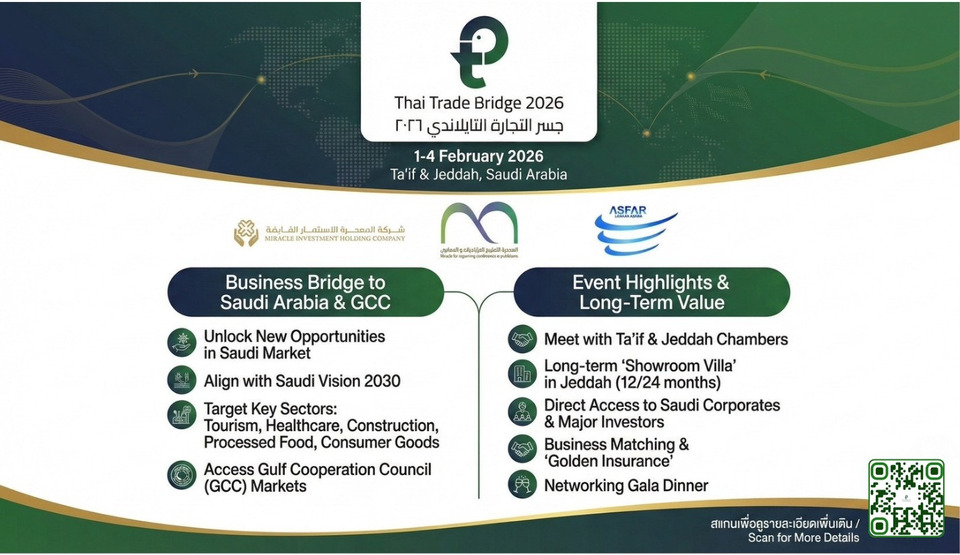 งานจะจัดขึ้นระหว่างวันที่ 1-4 กุมภาพันธ์ 2026 ที่เมืองตาอีฟและเจดดาห์ โดยมุ่งเป็นเวทีสำคัญให้ธุรกิจไทยได้เข้าถึงอุตสาหกรรมดาวรุ่งภายใต้กรอบวิสัยทัศน์ Saudi Vision 2030 ของรัฐบาลซาอุฯ ไม่ว่าจะเป็นอุตสาหกรรมการท่องเที่ยว สุขภาพ การก่อสร้าง อาหารแปรรูป บริการสุขภาพ และสินค้าอุปโภคบริโภค