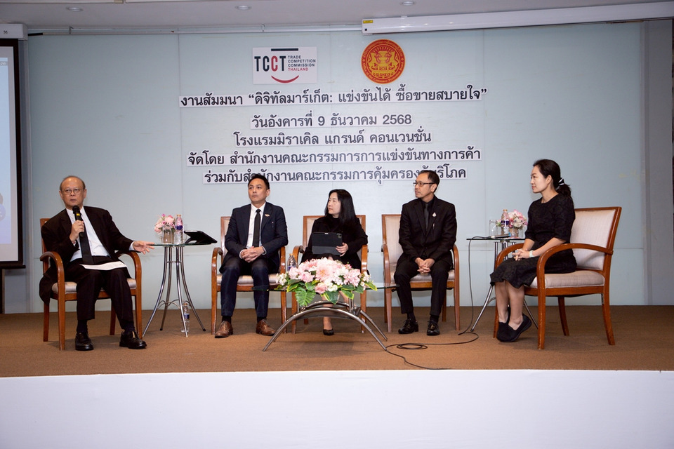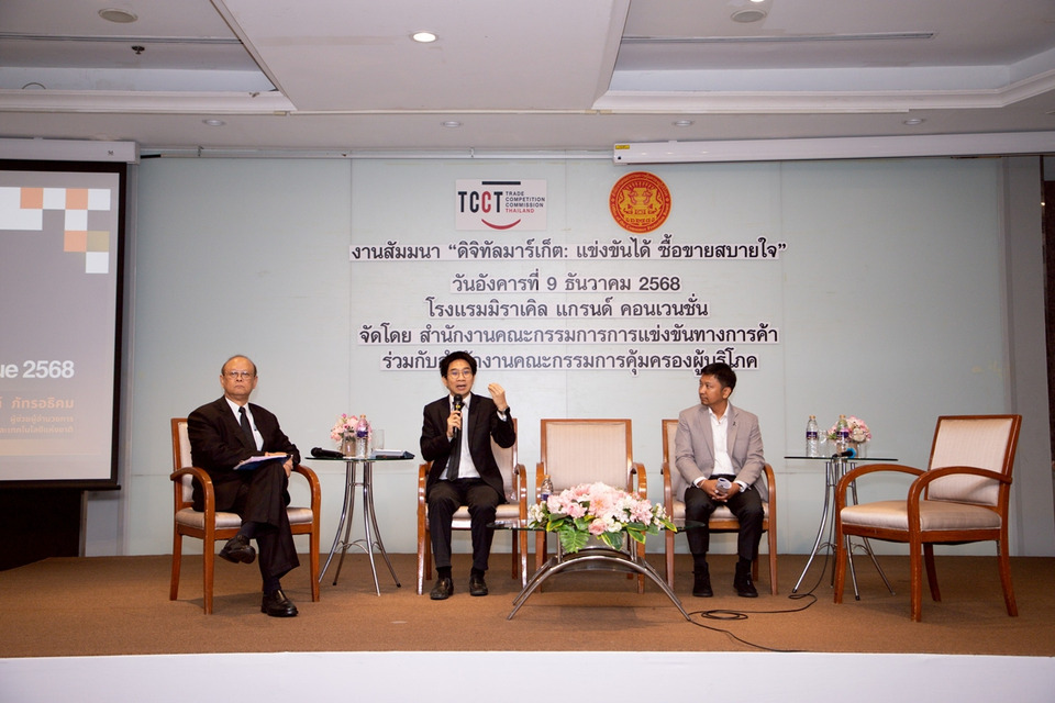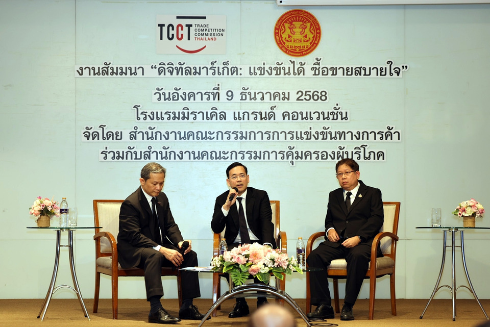 วันที่ 9 ธ.ค.68 สำนักงานคณะกรรมการการแข่งขันทางการค้า (สำนักงาน กขค.) ร่วมกับสำนักงานคณะกรรมการคุ้มครองผู้บริโภค (สคบ.) จัดงานสัมมนาสาธารณะ “ดิจิทัลมาร์เก็ต: แข่งขันได้ ซื้อขายสบายใจ” ณ โรงแรมมิราเคิล แกรนด์ คอนเวนชั่น กรุงเทพฯ การจัดงานสัมมนาครั้งนี้นับเป็นก้าวสำคัญในการบูรณาการความร่วมมือระหว่างสองหน่วยงาน เพื่อยกระดับการกำกับดูแลธุรกิจดิจิทัลแพลตฟอร์ม โดย สำนักงาน กขค. มุ่งกำกับดูแลผู้ประกอบธุรกิจทุกระดับเพื่อให้มีการแข่งขันทางการค้าที่เสรีและเป็นธรรม ในขณะเดียวกัน สคบ. มุ่งปกป้องคุ้มครองสิทธิของผู้บริโภค ซึ่งการแข่งขันที่เป็นธรรมย่อมเป็นเครื่องมือในการคุ้มครองผู้บริโภคในระยะยาวอย่างยั่งยืน