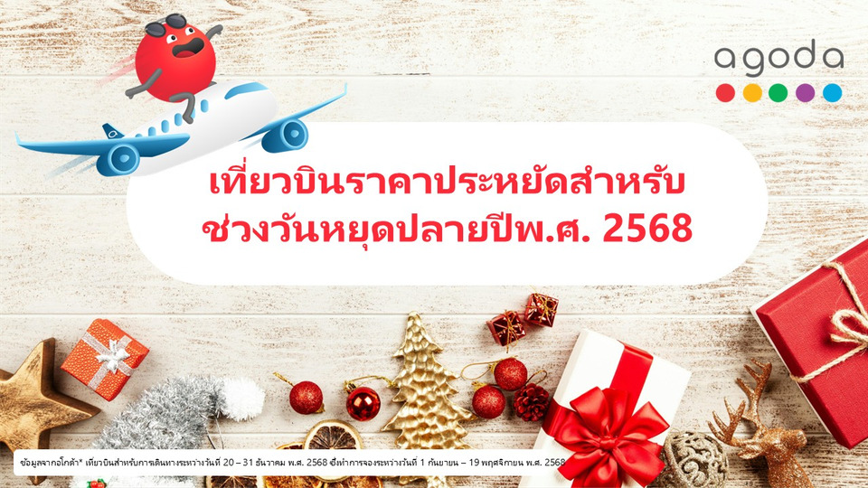 จากข้อมูลเที่ยวบินสำหรับการเดินทางระหว่างวันที่ 20 – 31 ธันวาคม พ.ศ. 2568 ซึ่งทำการจองระหว่างวันที่ 1 กันยายน – 19 พฤศจิกายน พ.ศ. 2568 อโกด้าเปิดเผยว่า ‘ประเทศไทย’ ครองตำแหน่งจุดหมายปลายทางที่มีเที่ยวบินภายในประเทศราคาประหยัดที่สุด โดยมีราคาเริ่มต้นเพียงประมาณ 190 บาท และสำหรับเส้นทางระหว่างประเทศ ‘มาเลเซีย’ และ ‘อินโดนีเซีย’ ครองแชมป์ร่วมกัน โดยในช่วงเวลาดังกล่าวมีเที่ยวบินเริ่มต้นเพียงประมาณ 795 บาทเท่านั้น ตามมาด้วยเที่ยวบินจากกระบี่ไปกัวลาลัมเปอร์ ด้วยราคาเริ่มต้นที่ประมาณ 895 บาท