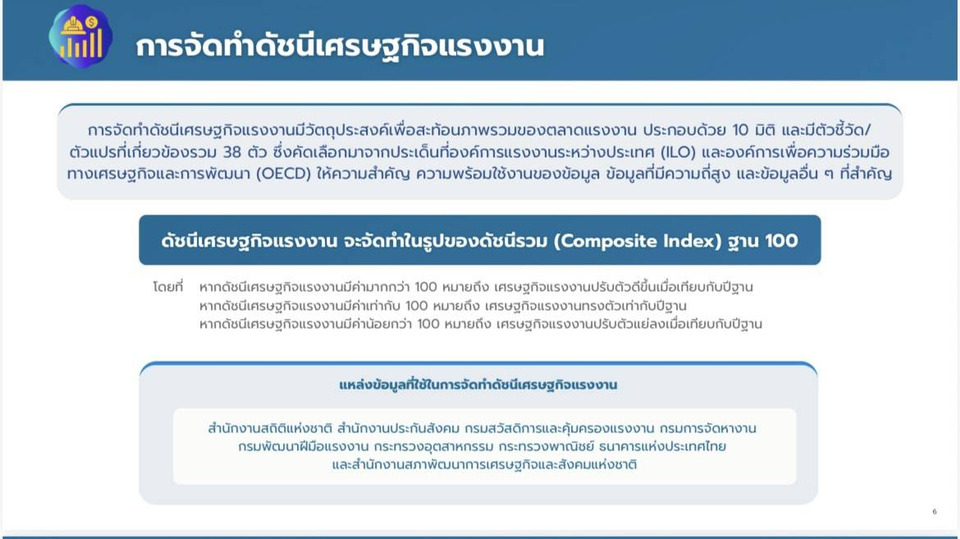 พันตำรวจโท วรรณพงษ์ คชรักษ์ ปลัดกระทรวงแรงงาน เปิดเผยว่า การพัฒนาระบบข้อมูลครั้งนี้เกิดจากความจำเป็นที่เศรษฐกิจและโครงสร้างแรงงานไทยกำลังเปลี่ยนแปลงอย่างรวดเร็ว ทั้งด้านเทคโนโลยี การเคลื่อนย้ายฐานการผลิต และความต้องการแรงงานทักษะสูงที่เพิ่มขึ้นอย่างต่อเนื่อง ทำให้การวางนโยบายด้านกำลังคนจำเป็นต้องมีข้อมูลที่ถูกต้อง ครอบคลุม และสามารถสะท้อนแนวโน้มในอนาคตได้ทันเวลา ดัชนีเศรษฐกิจแรงงานจะทำหน้าที่สะท้อนภาพรวมตลาดแรงงานผ่านข้อมูลการมีงานทำ การว่างงาน โครงสร้างผู้ประกันตน และการเคลื่อนไหวของแรงงานในภาคเศรษฐกิจต่าง ๆ ซึ่งจะช่วยให้การประเมินสถานการณ์แรงงานสอดคล้องกับวัฏจักรเศรษฐกิจได้อย่างแม่นยำยิ่งขึ้น ขณะเดียวกัน ดัชนีความเชื่อมั่นแรงงานจะช่วยติดตามมุมมองของแรงงานและสถานประกอบการต่อรายได้ การจ้างงาน และทิศทางเศรษฐกิจทำให้ภาครัฐสามารถตรวจจับสัญญาณการเปลี่ยนแปลงของตลาดแรงงานได้ตั้งแต่ช่วงต้นแบบทันท่วงที นอกจากนี้ กระทรวงแรงงานยังอยู่ระหว่างพัฒนาระบบประมาณการอุปสงค์อุปทานแรงงาน เพื่อคาดการณ์ความต้องการกำลังคนในสาขาอุตสาหกรรมสำคัญของประเทศ โดยผสานข้อมูลด้านการจ้างงาน ค่าจ้าง การผลิต และตัวแปรเศรษฐกิจมหภาค เพื่อรองรับการวางแผนกำลังคนและการลงทุนในอนาคตได้อย่างมีประสิทธิภาพ