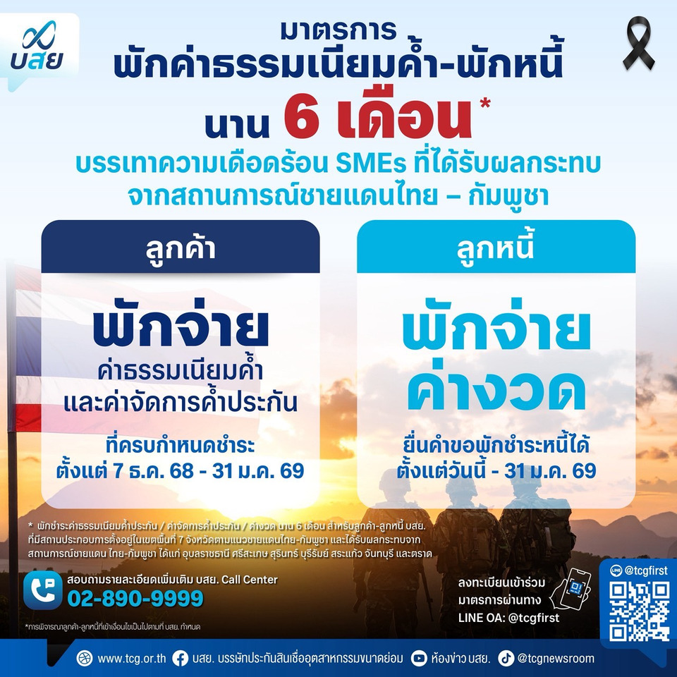 สำหรับลูกค้า-ลูกหนี้ บสย. ที่ได้รับผลกระทบจากเหตุพิพาทชายแดน และมีสถานประกอบการตั้งอยู่ในเขตพื้นที่ 7 จังหวัดตามแนวชายแดนไทย-กัมพูชา สามารถลงทะเบียนเข้าร่วมมาตรการฯ ผ่านช่องทาง LINE OA TCG First: @tcgfirst หรือสอบถามข้อมูลเพิ่มเติมได้ที่สำนักงานเขตในพื้นที่ และ บสย. Call Center โทร. 02-890-9999