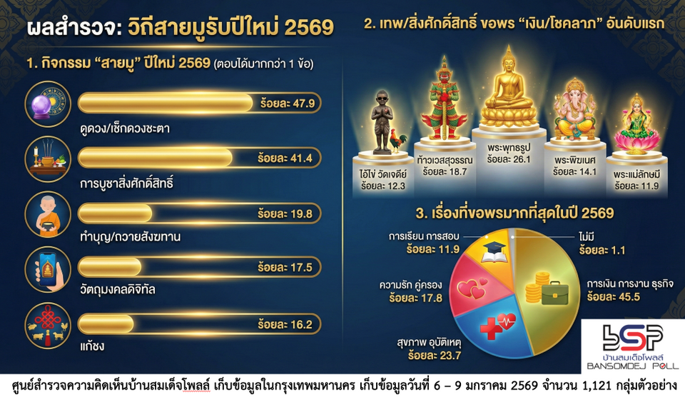 ศูนย์สำรวจความคิดเห็นบ้านสมเด็จโพลล์ มหาวิทยาลัยราชภัฏบ้านสมเด็จเจ้าพระยาได้ดำเนินโครงการสำรวจความคิดเห็นเกี่ยวกับความเชื่อกับการมูในช่วงปีใหม่โดยเก็บจากกลุ่มตัวอย่างจากประชาชนที่อาศัยอยู่ในจังหวัดกรุงเทพมหานคร จำนวนทั้งสิ้น 1,121 กลุ่มตัวอย่าง เก็บข้อมูลระหว่างวันที่ 6 – 9 มกราคม 2569