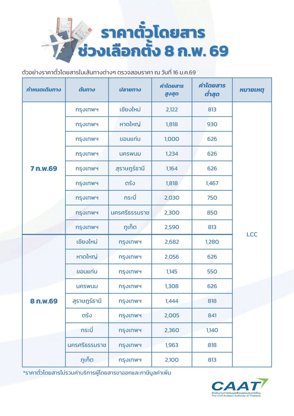 นายศรัณย เบ็ญจนิรัตน์ รองผู้อำนวยการสำนักงานการบินพลเรือนแห่งประเทศไทย สายงานพัฒนาเศรษฐกิจการบิน เปิดเผยว่า จากการตรวจสอบราคาค่าโดยสารในช่วงวันที่ 7–8 กุมภาพันธ์ 2569 พบว่า ทุกเส้นทางบินภายในประเทศยังไม่มีการจำหน่ายตั๋วโดยสารเกินอัตราเพดานราคาที่ CAAT กำหนด และบางเส้นทางยังคงมีตั๋วโดยสารในระดับราคาต่ำกว่า 1,000 บาท ให้ประชาชนสามารถเลือกซื้อเพื่อเดินทางกลับภูมิลำเนาไปใช้สิทธิเลือกตั้งได้ โดยจากการตรวจสอบราคาตั๋วโดยสาร เมื่อวันที่ 16 มกราคม 2569 พบว่า เส้นทางกรุงเทพฯ-เชียงใหม่ ช่วงวันที่ 7 กุมภาพันธ์ ราคาตั๋วโดยสาร (ไม่รวมค่าบริการผู้โดยสารขาออกและภาษีมูลค่าเพิ่ม) ต่ำสุดอยู่ที่ 813 บาท เส้นทางกรุงเทพฯ-หาดใหญ่ ราคาตั๋วโดยสารต่ำสุดอยู่ที่ 930 บาท เส้นทางกรุงเทพฯ-นครพนม ราคาตั๋วโดยสารต่ำสุดอยู่ที่ 626 บาท