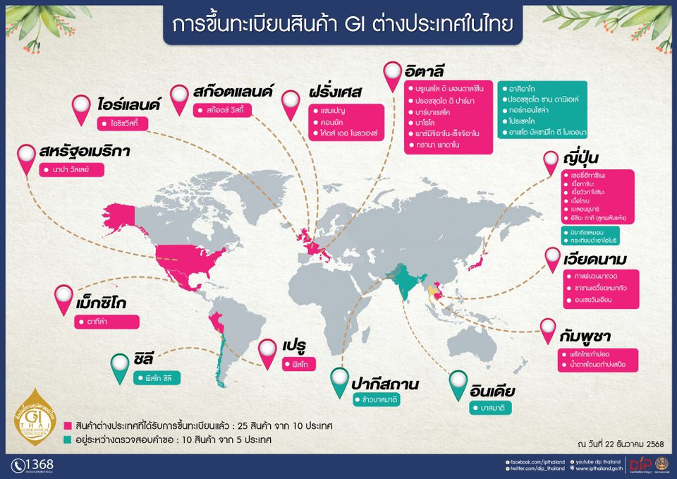 นางอรมน เพิ่มเติมว่า กรมทรัพย์สินทางปัญญายังคงมุ่งมั่นดำเนินภารกิจด้านการคุ้มครองและส่งเสริมสินค้า GI ของไทยอย่างต่อเนื่องทั้งในประเทศและต่างประเทศ โดยปัจจุบันมีสินค้า GI ที่ได้รับการขึ้นทะเบียนในไทยรวม 273 รายการ โดยเป็น GI ของต่างประเทศ เช่น ไวน์บรูเนลโล ดิ มอนตาลชิโน (อิตาลี) แชมเปญ (ฝรั่งเศส) ไอริช วิสกี้ (ไอร์แลนด์) เชอรี่ฮิกาชิเนะ (ญี่ปุ่น) กาแฟบวนมาถวด (เวียดนาม) รวม 25 รายการ และเป็น GI ของไทยเอง 248 รายการ สร้างมูลค่าตลาดสินค้า GI ไทยโดยรวมกว่า 114,000 ล้านบาท ขณะที่ GI ไทยที่ไปขึ้นทะเบียนในต่างประเทศมี 10 รายการ ใน 33 ประเทศ เช่น ข้าวหอมมะลิทุ่งกุลาร้องไห้ (ในสหภาพยุโรป มาเลเซีย และอินโดนีเซีย) ข้าวสังข์หยดเมืองพัทลุง (ในสหภาพยุโรป มาเลเซีย และอินโดนีเซีย) กาแฟดอยช้าง (ในสหภาพยุโรป และญี่ปุ่น) มะขามหวานเพชรบูรณ์ (ในเวียดนาม) ส้มโอทับทิมสยามปากพนัง (ในมาเลเซีย) เป็นต้น ซึ่งสะท้อนให้เห็นถึงศักยภาพของสินค้าอัตลักษณ์ไทยในเชิงพาณิชย์ โดยเฉพาะสินค้าในกลุ่มข้าว กาแฟ และผลไม้ไทย ซึ่งมีคุณภาพโดดเด่นเป็นที่ต้องการของผู้บริโภคอย่างกว้างขวางทั้งในไทยและต่างประเทศ ทั้งนี้ การคุ้มครอง GI ไทยในต่างประเทศ