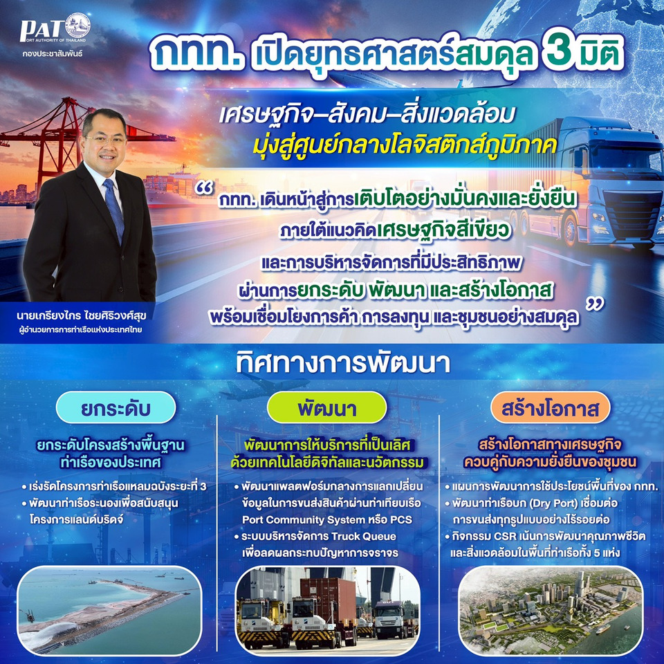 วันที่่ 21 มกราคม 2569 นายเกรียงไกร ไชยศิริวงศ์สุข ผู้อำนวยการการท่าเรือแห่งประเทศไทย (กทท.) เปิดเผยผลการดำเนินงานในไตรมาสที่ 1/2569 เผยว่า ภาพรวมสะท้อนการขยายตัวของกิจกรรมโลจิสติกส์และการค้าผ่านท่าเรืออย่างต่อเนื่อง เมื่อเทียบกับช่วงเดียวกันของปีก่อน โดยมีเรือเทียบท่ารวม 3,844 เที่ยว เพิ่มขึ้น 5.55% ปริมาณสินค้าผ่านท่ารวม 32.32 ล้านตัน เพิ่มขึ้น 6.82% และปริมาณตู้สินค้าผ่านท่ารวม 3.05 ล้าน ที.อี.ยู. เพิ่มขึ้น 10.65% ขณะที่ผลกำไรสุทธิอยู่ที่ 1,800 ล้านบาท เพิ่มขึ้น 4.80% สำหรับ ท่าเรือแหลมฉบัง ซึ่งเป็นท่าเรือหลักของประเทศ มีเรือเทียบท่า 2,735 เที่ยว เพิ่มขึ้น 7.63% ปริมาณสินค้าผ่านท่า 27.80 ล้านตัน เพิ่มขึ้น 9.26% และมีปริมาณตู้สินค้าผ่านท่ารวม 2.73 ล้านที.อี.ยู. เพิ่มขึ้น 12.28% โดยการเติบโตของสินค้าทั่วไปและสินค้าบรรจุตู้เพิ่มขึ้นถึง 9.46% สะท้อนการฟื้นตัวและการไหลเวียนของสินค้าในภาคอุตสาหกรรมและการค้าระหว่างประเทศอย่างต่อเนื่อง