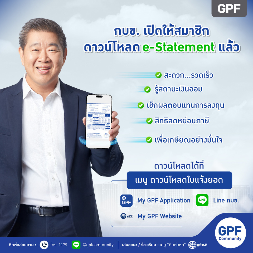 ทั้งนี้ สมาชิกสามารถดาวน์โหลด e‑Statement ที่เมนู ดาวน์โหลดใบแจ้งยอดเงิน ได้ 3 ช่องทางออนไลน์ ดังนี้ 1. My GPF Application 2. My GPF Website และ 3. LINE กบข. @gpfcommunity เข้าผ่านสมาร์ตโฟน และเพื่อส่งเสริมให้สมาชิกเลือกใช้บริการดิจิทัล กบข. เพิ่มมากขึ้น จึงได้จัดกิจกรรมพิเศษสำหรับผู้ที่ดาวน์โหลด e‑Statement ผ่าน LINE กบข. ตั้งแต่วันนี้เป็นต้นไป ร่วมลุ้นรับของรางวัลรวม 1,000 รางวัล อาทิ คูปองส่วนลดร้านพันธุ์ไทย มูลค่า 100 บาท และของรางวัลอื่น ๆ อีกมากมาย