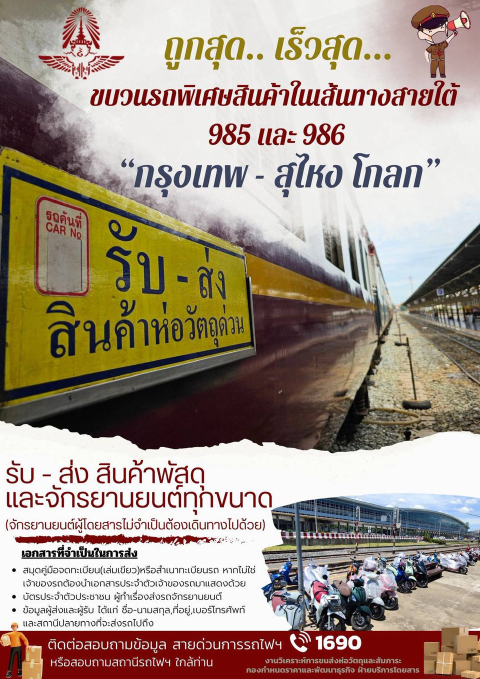 การรถไฟแห่งประเทศไทย ได้ขยายระยะเวลาการเดินรถขบวนพิเศษขนส่งสินค้าเส้นทางภาคใต้ ขบวนรถพิเศษสินค้าห่อวัตถุด่วนที่ 985/986 เส้นทางกรุงเทพ (หัวลำโพง) – สุไหงโกลก - กรุงเทพ (หัวลำโพง) ต่อไปอีก 1 ปี เพื่อให้ประชาชน เกษตรกร และภาคธุรกิจ สามารถขนส่งสินค้าที่เป็นสินค้าขนาดเล็กหรือขนาดใหญ่ในครั้งละจำนวนมากได้อย่างสะดวก และประหยัด รวมถึงเป็นการสนับสนุนการประกอบธุรกิจ SME และเกษตรกร เริ่มตั้งแต่วันนี้จนถึงวันที่ 31 ธันวาคม 2569