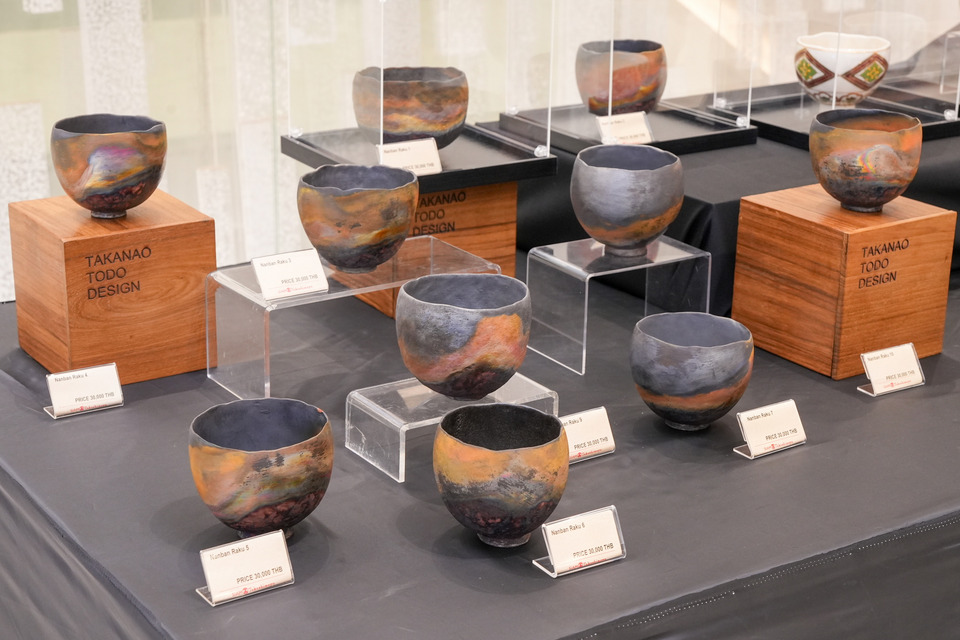 โดยผลงานไฮไลต์ที่นำมาจัดแสดงในครั้งนี้คือ ถ้วยชงชา (Chawan) ที่ผ่านกระบวนการเผาแบบ รากุ (Raku Firing) อันเป็นเทคนิคดั้งเดิมที่ทรงคุณค่า ที่เป็นศิลปะที่แสดงออกผ่านเครื่องใช้ประกอบในพิธีชงชาจากผลงานชั้นครูตั้งแต่ยุคโมโมยามะของญี่ปุ่น โดยนำมาสร้างสรรค์ใหม่ให้มีเอกลักษณ์เฉพาะตัว พร้อมเพิ่มความเป็นไทยด้วยลวดลายแบบเบญจรงค์จากแบรนด์ไทยอิเสคคิว นอกจากนี้ ภายในงานยังมีกิจกรรมเวิร์กชอปสุดเอ็กซ์คลูซีฟที่เปิดโอกาสให้ผู้สนใจได้สัมผัสโลกแห่งชาอย่างลึกซึ้ง พร้อมการสาธิตและชิมชาแบบญี่ปุ่นแท้ๆ โดยจำกัดเพียง 15 ท่านต่อรอบ เพื่อความเป็นส่วนตัวและสุนทรียภาพสูงสุด ได้แก่