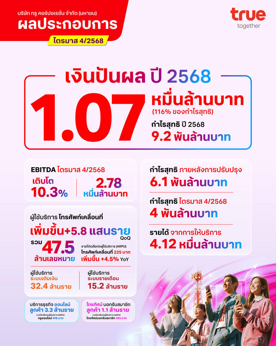 ทรู คอร์ปอเรชั่น ประกาศผลการดำเนินงานประจำไตรมาส 4/2568 โดยสามารถทำกำไรสุทธิได้ต่อเนื่องเป็นไตรมาสที่ 4 ติดต่อกัน บริษัทฯ รายงานผลกำไรสุทธิหลังหักภาษีจำนวน 4 พันล้านบาท และกำไรสุทธิหลังปรับปรุงรายการพิเศษ (Normalized Profit) จำนวน 6.1 พันล้านบาท สำหรับ EBITDA ในไตรมาสนี้อยู่ที่ 2.78 หมื่นล้านบาท สะท้อนผลประโยชน์เต็มไตรมาสจากการได้ใบอนุญาตคลื่นความถี่ ทั้งนี้ คณะกรรมการบริษัทฯ มีมติเสนอจ่ายเงินปันผลประจำปีจำนวน 4.1 พันล้านบาท ส่งผลให้เงินปันผลรวมทั้งปีอยู่ที่ 1.07 หมื่นล้านบาท คิดเป็นอัตราการจ่ายเงินปันผล 116% ของ NPAT ตามรายงาน และ 56% ของ NPAT หลังปรับปรุงรายการพิเศษ