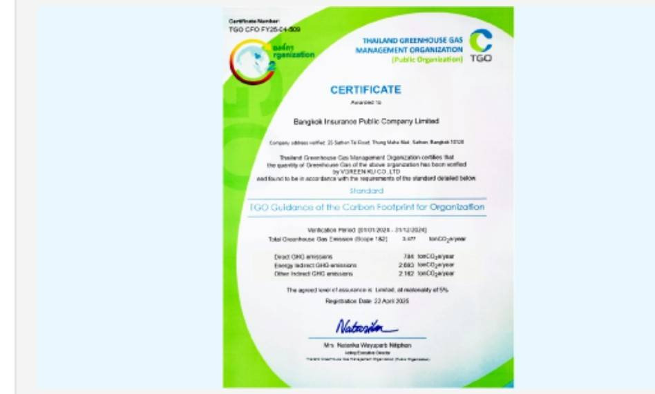 อนึ่งปีก่อนหน้านี้ บมจ.กรุงเทพประกันภัยก็เคยได้รับประกาศนียบัตรเครื่องหมาย “คาร์บอนฟุตพริ้นท์ขององค์กร” (Carbon Footprint for Organization หรือ CFO) ในพิธีมอบประกาศนียบัตรเครื่องหมายรับรองฉลากคาร์บอน จัดโดยองค์การบริหารจัดการก๊าซเรือนกระจก (องค์การมหาชน) ณ ห้อง Conference Hall สถาบันเพื่อการยุติธรรมแห่งประเทศไทย (องค์การมหาชน) ถนนแจ้งวัฒนะ กรุงเทพฯ เมื่อวันที่ 25 มิถุนายน 2568