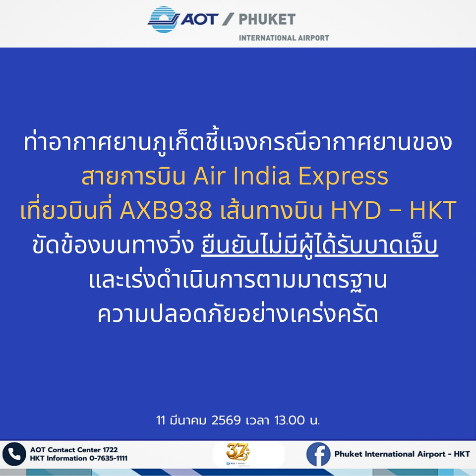 วันที่ 11 มีนาคม 2569 ท่าอากาศยานภูเก็ต (ทภก.) ขอชี้แจงกรณีอากาศยานของสายการบิน Air India Express เที่ยวบิน AXB938 เส้นทางบิน ไฮเดอราบัด (HYD) – ภูเก็ต (HKT) เกิดเหตุขัดข้องบนทางวิ่งภายหลังการลงจอดอากาศยานดังกล่าวเป็นแบบ Boeing 737-800 หมายเลขทะเบียน VT-BWQ เดินทางถึงท่าอากาศยานภูเก็ตก่อนเวลาตามแผน โดยมีกำหนดการลงจอดเวลา 11.40 น. และลงจอดจริงเวลา 11.24 น. บนเครื่องมีลูกเรือจำนวน 7 คน ผู้โดยสารขาเข้า 131 คน และทารก 2 คน