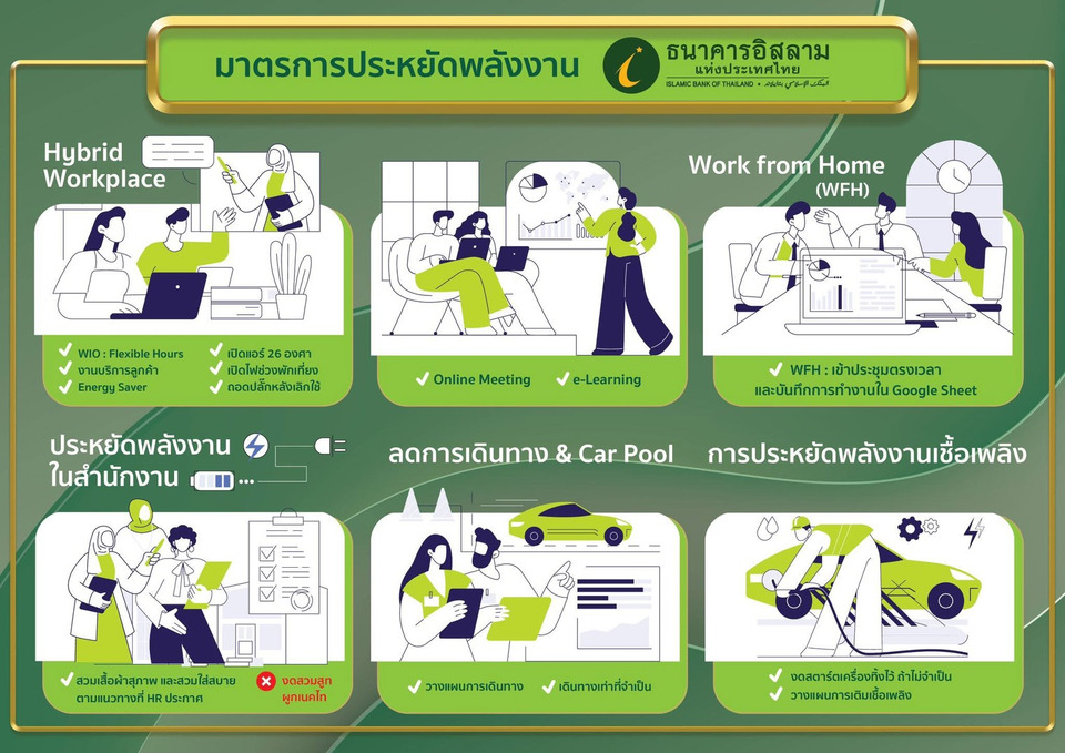 ดร.ทวีลาภ ฤทธาภิรมย์ กรรมการและผู้จัดการธนาคารอิสลามแห่งประเทศไทย (ไอแบงก์) เปิดเผยว่า ตามที่ประชุมคณะรัฐมนตรี มีมติเห็นชอบมาตรการเร่งด่วนเพื่อรับมือวิกฤตพลังงานจากสถานการณ์ในตะวันออกกลาง โดยมุ่งเน้นไปที่การประหยัดพลังงานและการบริหารจัดการบุคลากร ซึ่งเห็นถึงความจำเป็นอย่างยิ่งในการเตรียมความพร้อมและสนับสนุนมาตรการประหยัดพลังงานดังกล่าว ธนาคารฯ จึงมีแนวทางมาตรการประหยัดพลังงานของธนาคาร ดังนี้ 1) มาตรการ Work from Home ธนาคารให้ผู้บริหารทุกหน่วยงานจัดให้พนักงานปฏิบัติงาน ณ ที่พักอาศัย (Work from Home) ให้เหมาะสมกับภาระหน้าที่งาน โดยให้มีจำนวนพนักงานเพียงเท่าที่จำเป็นเท่านั้นที่จะเข้ามาปฏิบัติงานในสำนักงาน และไม่ส่งผลกระทบต่อการปฏิบัติงาน ยกเว้น หน่วยงานที่มีภารกิจในการให้บริการลูกค้าโดยตรง ให้ยังคงปฏิบัติหน้าที่ตามปกติเพื่อไม่ให้เกิดผลกระทบต่อการรับบริการของลูกค้า