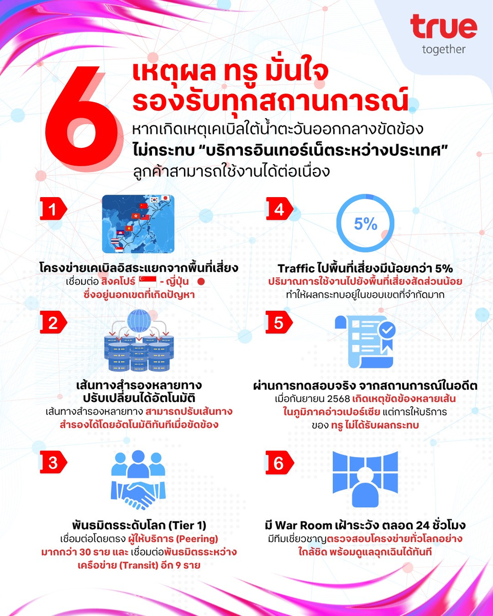 - โครงข่ายเคเบิลอิสระจากพื้นที่เสี่ยง โครงข่ายการเชื่อมต่อระหว่างประเทศของทรู รองรับด้วยระบบเคเบิลใต้น้ำ SJC2 (Southeast Asia–Japan Cable 2) ซึ่งเชื่อมต่อระหว่างสิงคโปร์และญี่ปุ่น โดยมีเส้นทางที่แยกออกจากภูมิภาคที่ได้รับผลกระทบอย่างชัดเจน และยังคงให้บริการได้ตามปกติอย่างต่อเนื่องโดยไม่ได้รับผลกระทบ