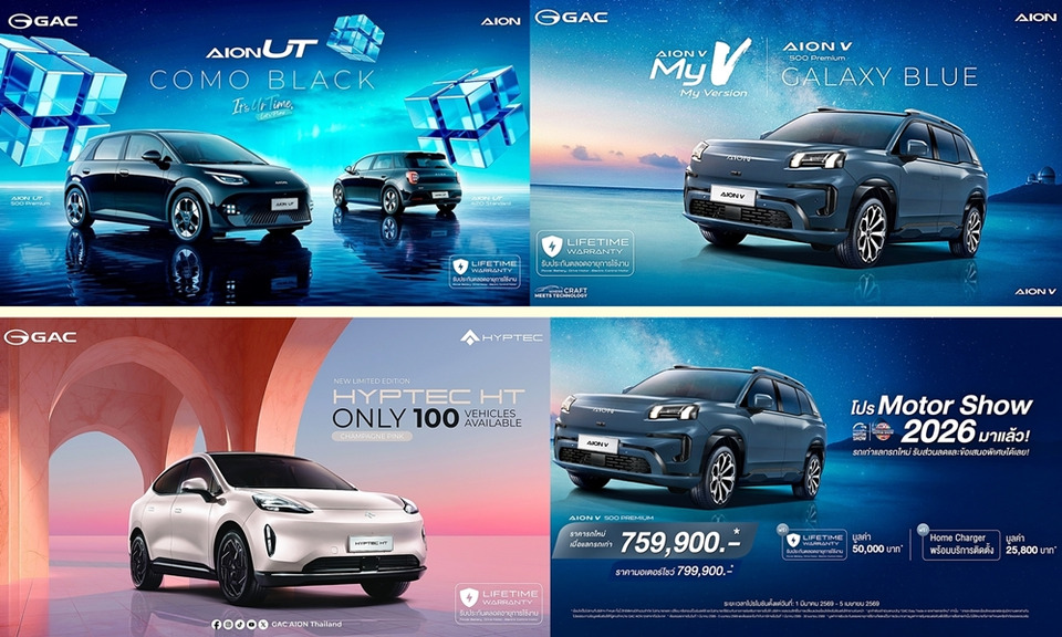 เมื่อวันที่ 23 มีนาคม 2569 GAC AION Thailand ประกาศความยิ่งใหญ่ในงาน Bangkok International Motor Show 2026 ขนทัพยนตรกรรมพลังงานทางเลือกใหม่จัดแสดงแบบเต็มพิกัด พร้อมไฮไลต์สำคัญถึง 3 ประการ ได้แก่ การเผยโฉมรถยนต์รุ่นใหม่ล่าสุด GAC AION V 500, การประกาศนโยบาย GAC CARE เพื่อยกระดับมาตรฐานการบริการหลังการขายแบบครบวงจร,และเปิดตัวโครงการ GAC Easy Trade-in, สะท้อนความมุ่งมั่นในการสร้างระบบนิเวศยานยนต์ไฟฟ้าที่สมบูรณ์แบบและยั่งยืนในประเทศไทย