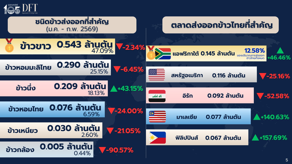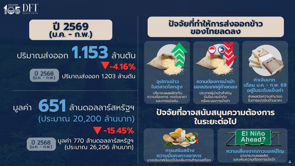 วันที่ 24 มีนาคม 2569 นางอารดา เฟื่องทอง อธิบดีกรมการค้าต่างประเทศ เปิดเผยสถิติการส่งออกข้าวของไทยในช่วงเดือนมกราคม – กุมภาพันธ์ 2569 ว่าไทยสามารถส่งออกข้าวได้ประมาณ 1.153 ล้านตัน ลดลง 4.16% และมีมูลค่ากว่า 651 ล้านดอลลาร์สหรัฐฯ (ประมาณ 20,200 ล้านบาท) ลดลง 15.45% เมื่อเทียบกับช่วงเดียวกันของปีก่อน ซึ่งเป็นผลจากปริมาณข้าวในตลาดโลกที่อยู่ในระดับสูง ส่งผลให้การแข่งขันด้านราคามีความรุนแรงมากขึ้น รวมถึงนโยบายจำกัดการนำเข้าของประเทศผู้นำเข้าสำคัญ เช่น อินโดนีเซีย และฟิลิปปินส์ สำหรับค่าเงินบาทที่ปัจจุบันแม้เริ่มอ่อนค่าลง แต่ยังถือว่าอยู่ในระดับที่ค่อนข้างแข็งค่าเมื่อเทียบกับผู้ส่งออกรายอื่นส่งผลต่อความสามารถในการแข่งขันด้านราคาส่งออกของข้าวไทย