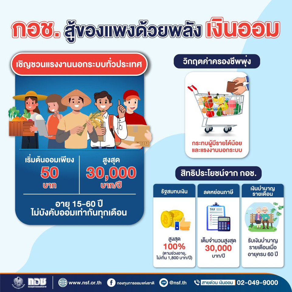 กอช.เผยสถานการณ์ค่าครองชีพไทยขยับตัวสูงขึ้นตามปัจจัยโลก กระทบค่าอาหารสดพุ่งทำสถิติใหม่ ห่วงแรงงานนอกระบบ ผู้มีรายได้น้อยแบกภาระหนัก ชูทางรอดด้วยการ “ออมเงินก้อนเล็ก” เพื่อสร้างเกราะป้องกันความผันผวนทางเศรษฐกิจ ย้ำออมกับ กอช. คือการลงทุนที่คุ้มค่าที่สุดในยุคเงินเฟ้อ ด้วยสิทธิประโยชน์รัฐช่วยสมทบและบำนาญตลอดชีพ
