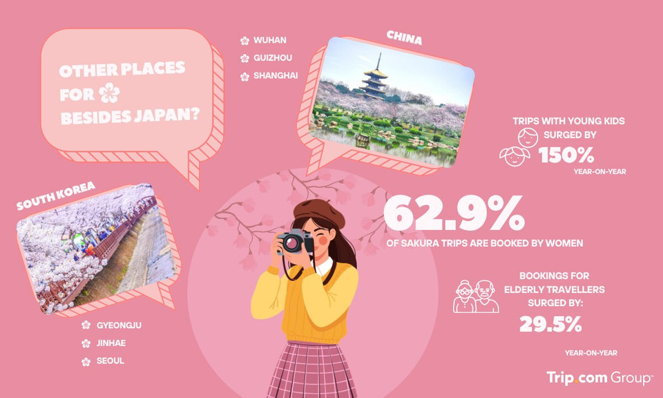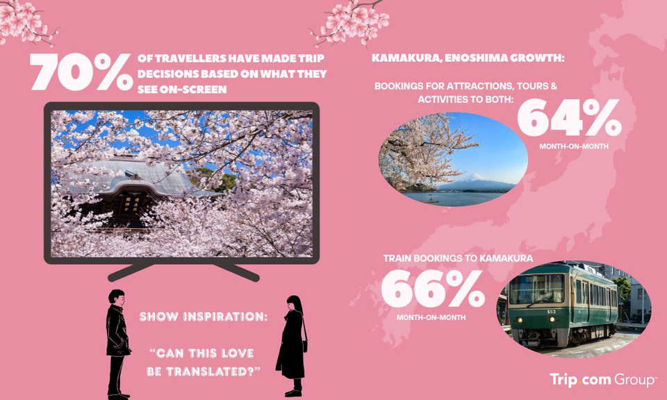 ข้อมูลการจองล่าสุดจาก Trip. com Group เผยว่า แม้จุดชมซากุระระดับไอคอนในประเทศญี่ปุ่นยังคงได้รับความนิยมอย่างต่อเนื่อง แต่นักท่องเที่ยวเริ่มหันไปเลือกจุดหมายปลายทางในเมืองรองเพิ่มมากขึ้น รวมถึงสถานที่ที่ปรากฏในซีรีส์ชื่อดัง เพื่อสัมผัสบรรยากาศที่คล้ายกับฉากในภาพยนตร์ พร้อมความเป็นส่วนตัวที่มากกว่าในช่วงพีคซีซัน