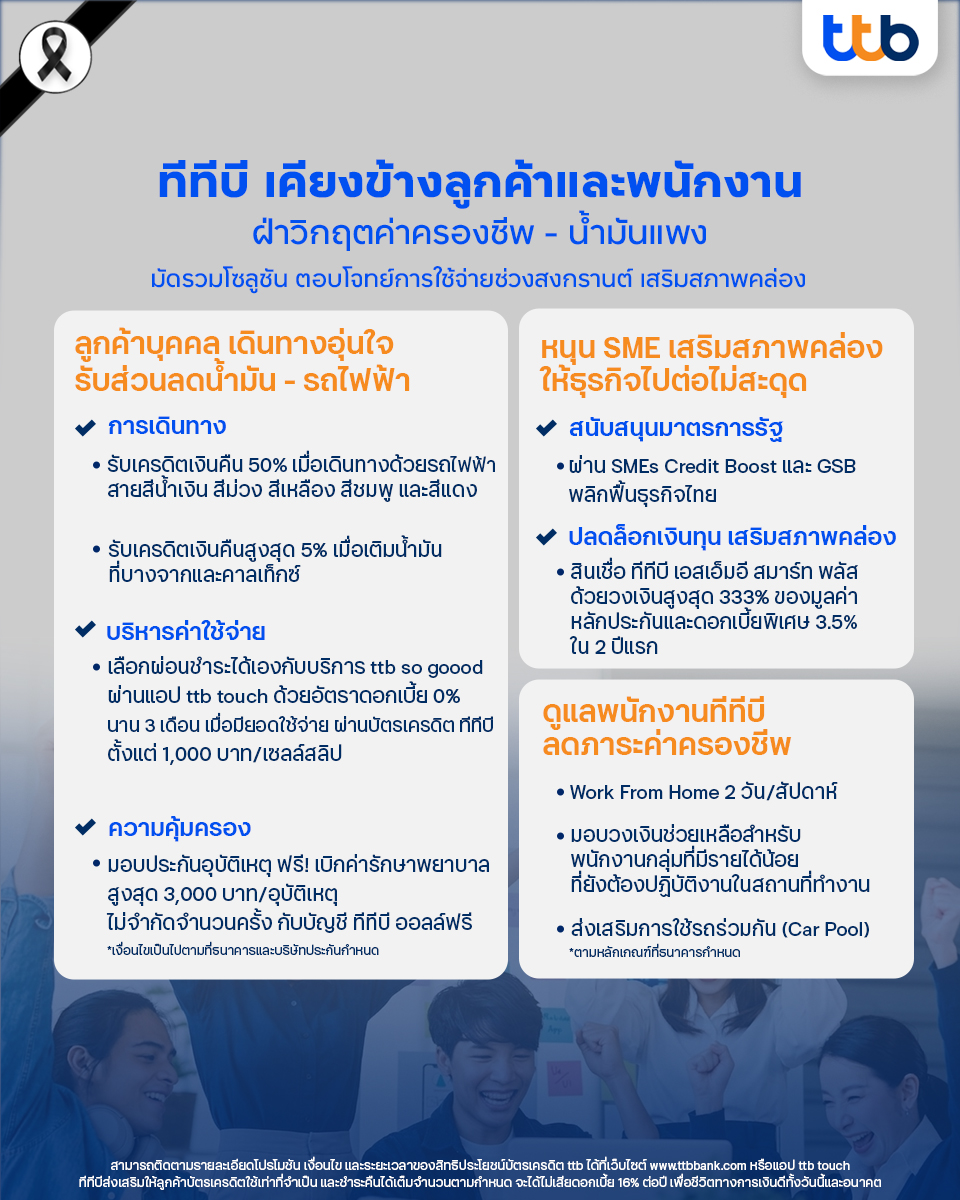 ทีทีบี ยืนหยัดเคียงข้างคนไทยในทุกสถานการณ์ เดินหน้าดูแลทั้งลูกค้าบุคคล ลูกค้า SME และพนักงานทั่วประเทศ เพื่อบรรเทาผลกระทบจากภาวะค่าครองชีพและราคาน้ำมันที่ปรับตัวสูงขึ้น โดยเฉพาะในช่วงเทศกาลสงกรานต์ที่มีค่าใช้จ่ายเพิ่มขึ้นอย่างมีนัยสำคัญ ด้วยโซลูชันทางการเงินที่ตอบโจทย์อย่างตรงจุด ช่วยเสริมสภาพคล่อง ลดภาระค่าใช้จ่าย และสนับสนุนการขับเคลื่อนเศรษฐกิจไทยให้เดินหน้าต่อได้อย่างมั่นคงท่ามกลางความผันผวน