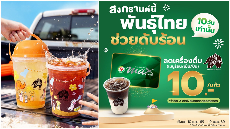 • ‘บักเก็ต บ๊อกบ๊อก’ พันธุ์ไทย x หมาจ๋า: ไอเทม Limited Edition ถังน้ำไซส์เบิ้ม 1 ลิตร ลายเส้นสุดละมุน จะใช้ใส่เครื่องดื่มหรือเป็นพร็อพเล่นน้ำก็คิวท์เกินต้าน เมื่อซื้อเครื่องดื่มเย็นเมนูเดียวกัน 2 แก้ว เพียง 99.- สำหรับสมาชิก Max Card Plus / EV และ 119.- สำหรับสมาชิก Max Card ตั้งแต่วันที่ 7 เม.ย. 69 - 16 เม.ย. 69 นี้ หรือจนกว่าสินค้าจะหมด ที่ร้านพันธุ์ไทยทุกสาขาที่ร่วมรายการ (ยกเว้นสาขาท่าอากาศยาน และเดลิเวอรี)