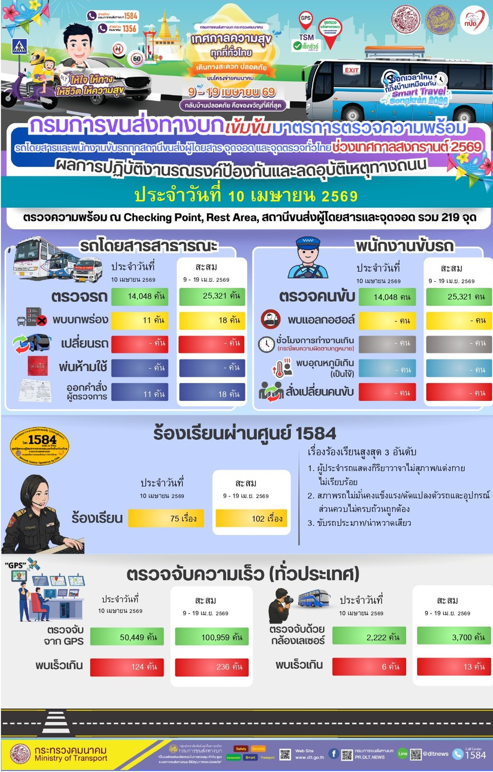 วันที่ 11 เมษายน 2569 นายสรพงศ์ ไพฑูรย์พงษ์ อธิบดีกรมการขนส่งทางบก เปิดเผยว่า กรมการขนส่งทางบก ได้ดำเนินการตามมาตรการอำนวยความสะดวกและปลอดภัย ช่วงเทศกาลสงกรานต์ 2569 โดยมีมาตรการตรวจความพร้อมรถโดยสารสาธารณะและพนักงานขับรถ ณ สถานีขนส่งผู้โดยสารและจุดจอด, จุดChecking Point และ Rest Area รวม 219 จุด ทั่วประเทศ ระหว่างวันที่ 9 – 19 เม.ย. 2569 เพื่อป้องกันและลดอุบัติเหตุทางถนนตลอดช่วงเทศกาลสงกรานต์ โดยคาดว่าในปีนี้จะมีประชาชนเดินทางกลับภูมิลำเนาหรือเดินทางท่องเที่ยวตามสถานที่ต่างๆ และเน้นย้ำให้ผู้ประกอบการขนส่ง ผู้ให้บริการสถานีขนส่งผู้โดยสารและจุดจอดทุกแห่ง ตรวจความพร้อมของรถและความพร้อมของผู้ขับรถก่อนออกเดินทาง ตามแบบ Checklist เช่น การมีใบอนุญาตขับรถที่ถูกต้อง ตามประเภทใบอนุญาตขับรถและไม่หมดอายุตรวจความพร้อมด้านร่างกายและการตรวจวัดระดับแอลกอฮอล์ในลมหายใจต้องเป็นศูนย์มิลลิกรัมเปอร์เซ็นต์ ชั่วโมงการขับรถไม่เกินที่กฎหมายกำหนด รถโดยสารสาธารณะทุกคันต้องมีสภาพมั่นคงแข็งแรงทั้งสภาพตัวรถภายนอกและภายใน รวมทั้งอุปกรณ์เพื่อความปลอดภัยต่างๆ ต้องพร้อมใช้งานอยู่เสมอพร้อมจัดเจ้าหน้าที่ให้คำแนะนำและให้ความรู้แก่ผู้โดยสารกรณีเกิดเหตุฉุกเฉินและขอให้ผู้โดยสารทุกที่นั่งคาดเข็มขัดนิรภัยตลอดการเดินทางเพื่อป้องกันการบาดเจ็บและเสียชีวิตเมื่อรถเกิดอุบัติเหตุ