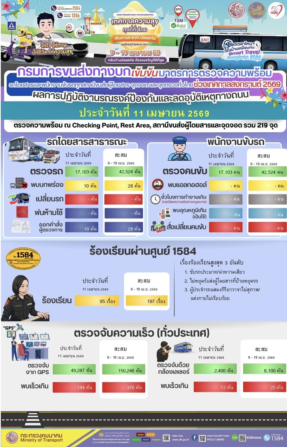 วันที่ 12 เมษายน 2569 นายสรพงศ์ ไพฑูรย์พงษ์ อธิบดีกรมการขนส่งทางบก เปิดเผยว่า กรมขนส่งฯได้ดำเนินการตามมาตรการอำนวยความสะดวกและปลอดภัย ช่วงเทศกาลสงกรานต์ 2569 โดยมีมาตรการตรวจความพร้อมรถโดยสารสาธารณะและพนักงานขับรถ ณ สถานีขนส่งผู้โดยสารและจุดจอด, จุดChecking Point และ Rest Area รวม 219 จุดทั่วประเทศ ระหว่างวันที่ 9 – 19 เม.ย. 2569 เพื่อป้องกันและลดอุบัติเหตุทางถนนตลอดช่วงเทศกาลสงกรานต์ โดยคาดว่าในปีนี้จะมีประชาชนเดินทางกลับภูมิลำเนาหรือเดินทางท่องเที่ยวตามสถานที่ต่างๆ และเน้นย้ำให้ผู้ประกอบการขนส่ง ผู้ให้บริการสถานีขนส่งผู้โดยสารและจุดจอดทุกแห่ง ตรวจความพร้อมของรถและความพร้อมของผู้ขับรถก่อนออกเดินทาง ตามแบบ Checklist เช่น การมีใบอนุญาตขับรถที่ถูกต้อง ตามประเภทใบอนุญาตขับรถและไม่หมดอายุตรวจความพร้อมด้านร่างกายและการตรวจวัดระดับแอลกอฮอล์ในลมหายใจต้องเป็นศูนย์มิลลิกรัมเปอร์เซ็นต์ ชั่วโมงการขับรถไม่เกินที่กฎหมายกำหนด รถโดยสารสาธารณะทุกคันต้องมีสภาพมั่นคงแข็งแรงทั้งสภาพตัวรถภายนอกและภายใน รวมทั้งอุปกรณ์เพื่อความปลอดภัยต่างๆต้องพร้อมใช้งานอยู่เสมอพร้อมจัดเจ้าหน้าที่ให้คำแนะนำและให้ความรู้แก่ผู้โดยสารกรณีเกิดเหตุฉุกเฉินและขอให้ผู้โดยสารทุกที่นั่งคาดเข็มขัดนิรภัยตลอดการเดินทางเพื่อป้องกันการบาดเจ็บและเสียชีวิตเมื่อรถเกิดอุบัติเหตุ