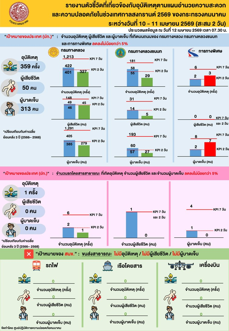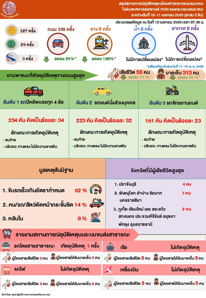 ศปภ.คค. สรุปสถิติอุบัติเหตุบนโครงข่ายของกระทรวงคมนาคม ในช่วงวันที่ 10 - 11 เมษายน 2569 (สะสม 2 วัน) พบว่า ทางถนน เกิดอุบัติเหตุ 359 ครั้ง มีผู้บาดเจ็บ 313 คน เสียชีวิต 50 คน สาเหตุเกิดจากขับรถเร็วเกินอัตรากำหนด คิดเป็นร้อยละ 62 ยานพาหนะที่เกิดเหตุสูงสุด คือ รถปิคอัพบรรทุก 4 ล้อ คิดเป็นร้อยละ 34 บริเวณที่เกิดเหตุสูงสุด คือ ทางตรงไม่มีความลาดชัน คิดเป็นร้อยละ 73 จังหวัดที่มีผู้เสียชีวิตสูงสุด คือ ปราจีนบุรี (4 คน) และจังหวัดที่เกิดเหตุสูงสุด คือ นครราชสีมา (26 ครั้ง) เมื่อเปรียบเทียบกับช่วงเดียวกันของปีที่ผ่านมา (11 - 12 เมษายน 2568) พบว่า จำนวนอุบัติเหตุลดลงร้อยละ 29 ผู้เสียชีวิตลดลงร้อยละ 15 และผู้บาดเจ็บลดลงร้อยละ 29 สำหรับการเดินทางในโหมดอื่น ๆ ได้แก่ ทางอากาศ ทางน้ำ และทางราง ไม่พบการเกิดอุบัติเหตุ