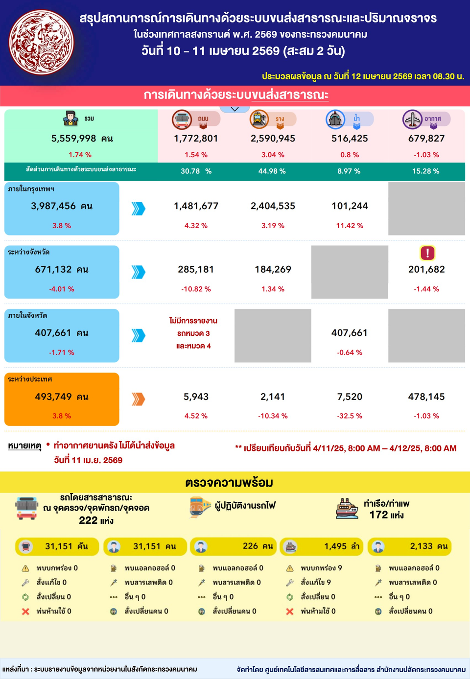 กระทรวงคมนาคมโดยศูนย์ปฏิบัติการความปลอดภัยคมนาคม (ศปภ.คค.) เปิดเผยข้อมูลภาพรวมการเดินทางของประชาชนในช่วงเทศกาลสงกรานต์ 2569 ระหว่างวันที่ 10 - 11 เมษายน 2569 พบว่า หน่วยงานในสังกัดได้บูรณาการร่วมกันเพื่ออำนวยความสะดวกและดูแลความปลอดภัยการเดินทางอย่างใกล้ชิด ตามนโยบาย “ออกเวลาไหนก็ถึงบ้านเหมือนกัน Smart Travel Songkran 2026” ของนายพิพัฒน์ รัชกิจประการ รองนายกรัฐมนตรีและรัฐมนตรีว่าการกระทรวงคมนาคม โดยสามารถบริหารจัดการการเดินทางให้ประชาชนกลับภูมิลำเนาได้อย่างเพียงพอและไม่มีผู้โดยสารตกค้าง