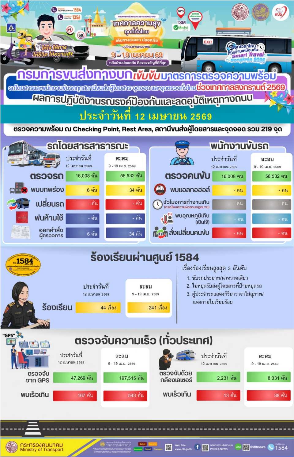 วันที่่ 13 เมษายน 2569 นายสรพงศ์ ไพฑูรย์พงษ์ อธิบดีกรมการขนส่งทางบก เปิดเผยว่า กรมการขนส่งทางบก ได้ดำเนินการตามมาตรการอำนวยความสะดวกและปลอดภัย ช่วงเทศกาลสงกรานต์ 2569 โดยมีมาตรการตรวจความพร้อมรถโดยสารสาธารณะและพนักงานขับรถ ณ สถานีขนส่งผู้โดยสารและจุดจอด, จุดChecking Point และ Rest Area รวม 219 จุด ทั่วประเทศ ระหว่างวันที่ 9 – 19 เม.ย. 2569 เพื่อป้องกันและลดอุบัติเหตุทางถนนตลอดช่วงเทศกาลสงกรานต์ โดยคาดว่าในปีนี้จะมีประชาชนเดินทางกลับภูมิลำเนาหรือเดินทางท่องเที่ยวตามสถานที่ต่างๆ และเน้นย้ำให้ผู้ประกอบการขนส่ง ผู้ให้บริการสถานีขนส่งผู้โดยสารและจุดจอดทุกแห่ง ตรวจความพร้อมของรถและความพร้อมของผู้ขับรถก่อนออกเดินทาง ตามแบบ Checklist เช่น การมีใบอนุญาตขับรถที่ถูกต้อง ตามประเภทใบอนุญาตขับรถและไม่หมดอายุตรวจความพร้อมด้านร่างกายและการตรวจวัดระดับแอลกอฮอล์ในลมหายใจต้องเป็นศูนย์มิลลิกรัมเปอร์เซ็นต์ ชั่วโมงการขับรถไม่เกินที่กฎหมายกำหนด รถโดยสารสาธารณะทุกคันต้องมีสภาพมั่นคงแข็งแรงทั้งสภาพตัวรถภายนอกและภายใน รวมทั้งอุปกรณ์เพื่อความปลอดภัยต่างๆ ต้องพร้อมใช้งานอยู่เสมอพร้อมจัดเจ้าหน้าที่ให้คำแนะนำและให้ความรู้แก่ผู้โดยสารกรณีเกิดเหตุฉุกเฉินและขอให้ผู้โดยสารทุกที่นั่งคาดเข็มขัดนิรภัยตลอดการเดินทางเพื่อป้องกันการบาดเจ็บและเสียชีวิตเมื่อรถเกิดอุบัติเหตุ สำหรับผลการดำเนินการตรวจความพร้อม ในวันที่ 12 เมษายน 2569 ตรวจรถโดยสารสาธารณะแล้ว 16,008 คัน พบรถบกพร่อง 6 คัน ดำเนินการออกคำสั่งผู้ตรวจการแล้วทุกคัน ส่วนการตรวจความพร้อมพนักงานขับรถจำนวน 16,008 ราย ไม่พบพนักงานขับรถบกพร่อง