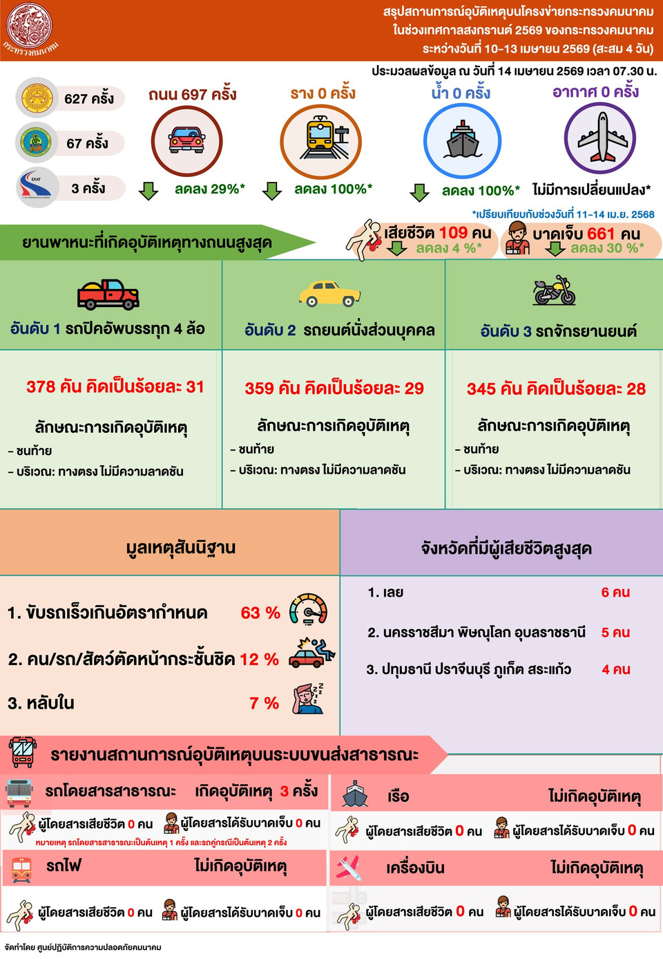 สำหรับสถิติอุบัติเหตุบนโครงข่ายของกระทรวงคมนาคมสะสม 4 วัน พบว่า โครงข่ายทางบกเกิดอุบัติเหตุรวม 697 ครั้ง มีผู้บาดเจ็บ 661 คน เสียชีวิต 109 คน สาเหตุหลักเกิดจากการขับรถเร็วเกินกำหนด 442 ครั้ง คิดเป็นร้อยละ 63 ยานพาหนะที่เกิดเหตุสูงสุดคือ รถพิกอัปบรรทุก 4 ล้อ 378 คัน ลักษณะพื้นที่เกิดเหตุส่วนใหญ่เป็นทางตรงไม่มีความลาดชัน 504 ครั้ง คิดเป็นร้อยละ 72 จังหวัดเลยมีผู้เสียชีวิตสูงสุด 6 คน ขณะที่กรุงเทพฯ เกิดอุบัติเหตุสูงสุด 35 ครั้ง ทั้งนี้ เมื่อเปรียบเทียบกับช่วงเดียวกันของปีที่ผ่านมาพบว่า อุบัติเหตุลดลงร้อยละ 29 ผู้เสียชีวิตลดลงร้อยละ 4 และผู้บาดเจ็บลดลงร้อยละ 30 ส่วนระบบขนส่งรถโดยสารสาธารณะเกิดอุบัติเหตุ 3 ครั้ง ไม่มีผู้บาดเจ็บหรือผู้เสียชีวิต ขณะที่โครงข่ายทางราง ทางน้ำ และทางอากาศไม่มีรายงานอุบัติเหตุ