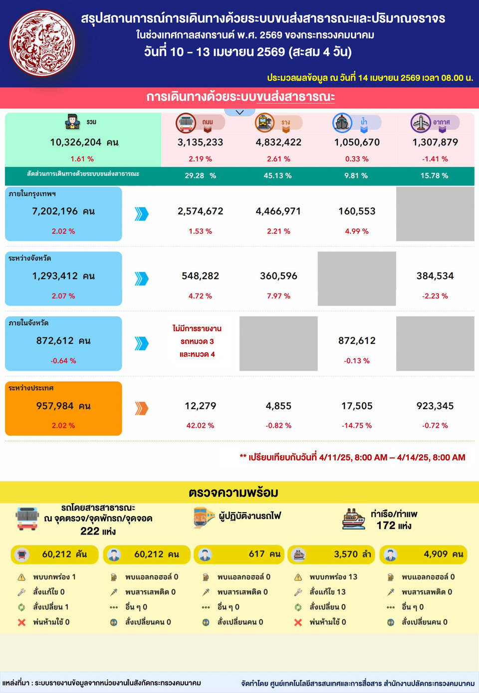 วันนี้ (14 เมษายน 2569) นายพิพัฒน์ รัชกิจประการ รองนายกรัฐมนตรีและรัฐมนตรีว่าการกระทรวงคมนาคม เปิดเผยว่า ศูนย์ปฏิบัติการความปลอดภัยคมนาคม (ศปภ.คค.) กระทรวงคมนาคม ได้รายงานสรุปข้อมูลการเดินทางบนโครงข่ายคมนาคมในช่วงเทศกาลสงกรานต์ 2569 ระหว่างวันที่ 10 - 13 เมษายน 2569 สะสม 4 วัน (ข้อมูล ณ วันที่ 14 เมษายน 2569 เวลา 08.00 น.) พบว่า ระบบขนส่งสาธารณะสามารถรองรับการเดินทางของประชาชนได้อย่างเพียงพอ โดยมีการเดินทางด้วยระบบขนส่งสาธารณะรวม 10,326,204 คน เพิ่มขึ้นร้อยละ 1.61 เมื่อเปรียบเทียบกับช่วงเวลาเดียวกันของปีที่ผ่านมา (11 - 14 เมษายน 2568) ทั้งนี้ ระบบรางมีสัดส่วนการใช้บริการสูงสุด คิดเป็นร้อยละ 45.13 ขณะที่ผู้ใช้บริการสูงสุดในแต่ละภูมิภาค ได้แก่ ภาคกลาง (ทางอากาศขาออก) 202,912 คน ภาคใต้ (ทางราง) 127,098 คน ภาคตะวันออกเฉียงเหนือ (ทางถนน) 145,390 คน ภาคเหนือ (ทางถนน) 78,414 คน และภาคตะวันออก (ทางถนน) 80,095 คน ส่วนการเดินทางด้วยระบบขนส่งสาธารณะระหว่างประเทศรวม 957,984 คน สำหรับการจราจรเข้า - ออกกรุงเทพฯ บนทางหลวงสายหลัก 12 เส้นทาง มีปริมาณ 3,929,088 คัน ลดลงร้อยละ 1.95 และการเดินทางภายในกรุงเทพฯ บนทางพิเศษของการทางพิเศษแห่งประเทศไทย (กทพ.) มีปริมาณ 5,037,814 คัน ลดลงร้อยละ 6.12