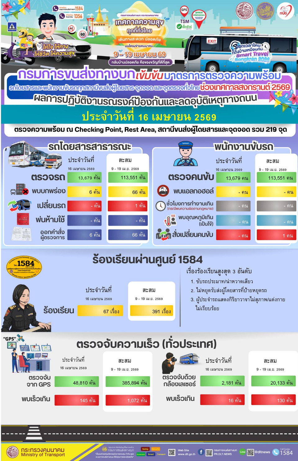 วันที่ 17 เมษายน 2569 นายสรพงศ์ ไพฑูรย์พงษ์ อธิบดีกรมการขนส่งทางบก เปิดเผยว่า กรมการขนส่งทางบก ได้ดำเนินการตามมาตรการอำนวยความสะดวกและปลอดภัย ช่วงเทศกาลสงกรานต์ 2569 โดยมีมาตรการตรวจความพร้อมรถโดยสารสาธารณะและพนักงานขับรถ ณ สถานีขนส่งผู้โดยสารและจุดจอด, จุด Checking Point และ Rest Area รวม 219 จุด ทั่วประเทศ ระหว่างวันที่ 9 – 19 เม.ย. 2569 เพื่อป้องกันและลดอุบัติเหตุทางถนนตลอดช่วงเทศกาลสงกรานต์ โดยคาดว่าในปีนี้จะมีประชาชนเดินทางกลับภูมิลำเนาหรือเดินทางท่องเที่ยวตามสถานที่ต่าง ๆ และเน้นย้ำให้ผู้ประกอบการขนส่ง ผู้ให้บริการสถานีขนส่งผู้โดยสารและจุดจอดทุกแห่ง ตรวจความพร้อมของรถและความพร้อมของผู้ขับรถก่อนออกเดินทาง ตามแบบ Checklist เช่น การมีใบอนุญาตขับรถที่ถูกต้อง ตามประเภทใบอนุญาตขับรถและไม่หมดอายุตรวจความพร้อมด้านร่างกายและการตรวจวัดระดับแอลกอฮอล์ในลมหายใจต้องเป็นศูนย์มิลลิกรัมเปอร์เซ็นต์ ชั่วโมงการขับรถไม่เกินที่กฎหมายกำหนด รถโดยสารสาธารณะทุกคันต้องมีสภาพมั่นคงแข็งแรงทั้งสภาพตัวรถภายนอกและภายใน รวมทั้งอุปกรณ์เพื่อความปลอดภัยต่าง ๆ ต้องพร้อมใช้งานอยู่เสมอพร้อมจัดเจ้าหน้าที่ให้คำแนะนำและให้ความรู้แก่ผู้โดยสารกรณีเกิดเหตุฉุกเฉินและขอให้ผู้โดยสารทุกที่นั่งคาดเข็มขัดนิรภัยตลอดการเดินทางเพื่อป้องกันการบาดเจ็บและเสียชีวิตเมื่อรถเกิดอุบัติเหตุ สำหรับผลการดำเนินการตรวจความพร้อม ในวันที่ 16 เมษายน 2569 ตรวจรถโดยสารสาธารณะแล้ว 13,679 คัน พบรถบกพร่อง 6 คัน สั่งเปลี่ยนรถ - คัน ดำเนินการออกคำสั่งผู้ตรวจการแล้วทุกคัน ส่วนการตรวจความพร้อมพนักงานขับรถจำนวน 13,679 ราย ไม่พบพนักงานขับรถบกพร่อง