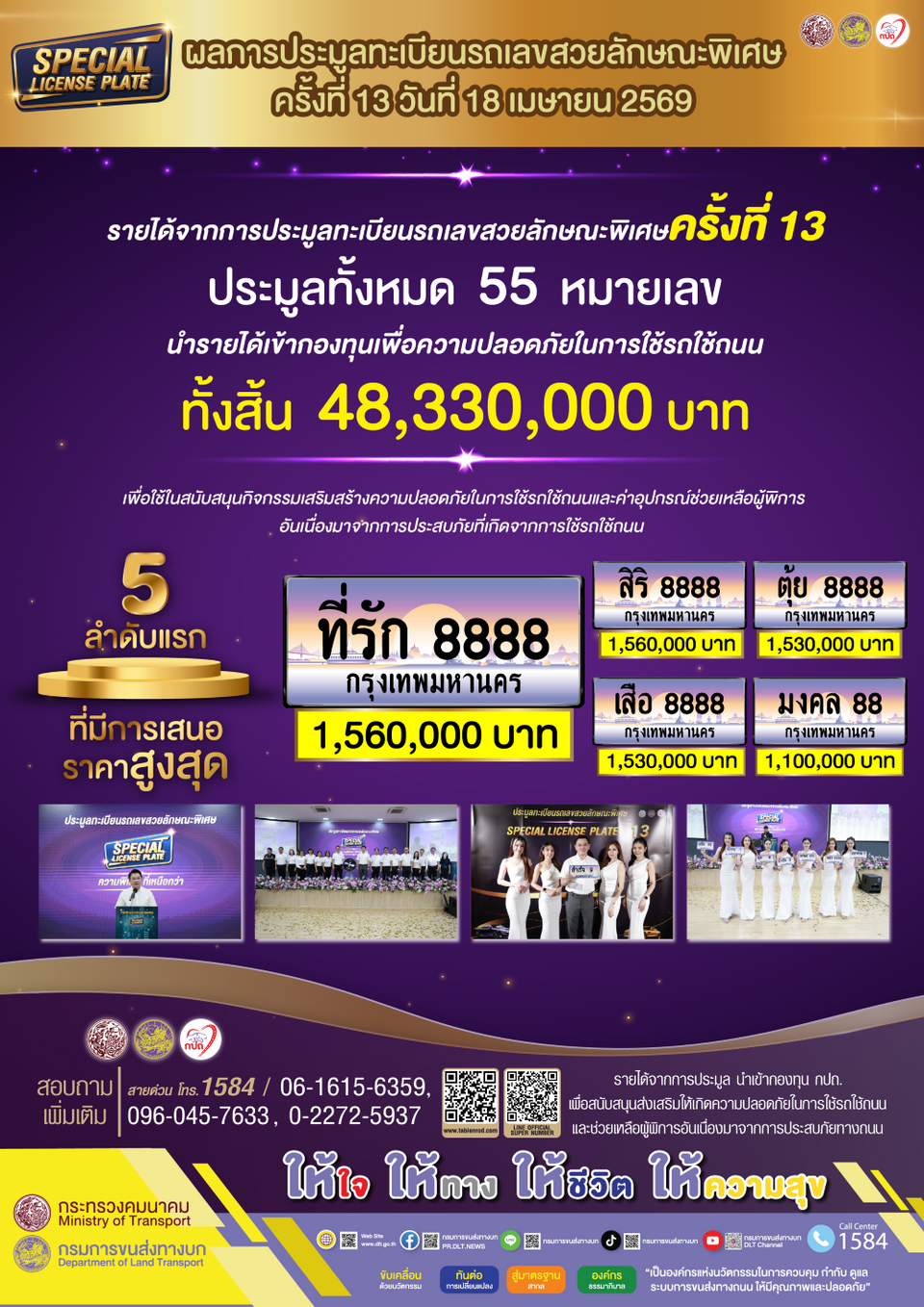 วันที่ 18 เมษายน 2569 นายสรพงศ์ ไพฑูรย์พงษ์ อธิบดีกรมการขนส่งทางบก เปิดเผยว่า กรมการขนส่งทางบก โดยกองทุนเพื่อความปลอดภัยในการใช้รถใช้ถนน (กปถ.) จัดการประมูลหมายเลขทะเบียนรถที่มีลักษณะพิเศษ ครั้งที่ 13 วันเสาร์ที่ 18 เมษายน 2569 ณ กรมการขนส่งทางบก มีผู้ที่สนใจเข้าร่วมประมูลทางวาจา และประมูลผ่านระบบอินเทอร์เน็ตที่ www.tabienrod.com โดยหมายเลขทะเบียนที่ได้รับความนิยมและทำราคาได้สูงสุดคือ “ ที่รัก 8888” จบสถิติที่ราคา “ 1,560,000 ” บาท มีผู้ประมูลร่วมเสนอราคาถึง 3 ครั้ง รองลงมา ได้แก่ หมายเลขทะเบียน “ สิริ 8888 ” ประมูลได้ในราคา “ 1,560,000 ” บาท นอกจากนี้ยังมีหมายเลขทะเบียนอื่นที่ได้รับความนิยมมากเช่นกัน อาทิ “ ตุ้ย 8888 ” ประมูลได้ในราคา “ 1,530,000 ” บาท, “ เสือ 8888 ” ประมูลได้ในราคา “ 1,530,000 ” บาท, “ มงคล 88 ” ประมูลได้ในราคา “ 1,100,000 ” บาท