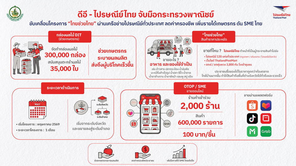 นอกจากนี้ ไปรษณีย์ไทยยังร่วมมือกับกรมพัฒนาธุรกิจการค้าให้การสนับสนุนการนำสินค้า OTOP และ SMEs เข้าสู่ช่องทางการจำหน่ายออนไลน์ผ่านแพลตฟอร์ม ThailandPostMart ควบคู่กับความร่วมมือบนแพลตฟอร์มชั้นนำ อาทิ Shopee, Lazada, TikTok, LINE MAN และ Grab โดยมีผู้ประกอบการเข้าร่วมประมาณ 2,000 ราย รวมสินค้ากว่า 600,000 รายการ พร้อมได้รับการสนับสนุนค่าขนส่ง 100 บาทต่อคำสั่งซื้อ และการยกเว้นค่าธรรมเนียม (GP) เป็นกรณีพิเศษ เพื่อเพิ่มโอกาสในการเข้าถึงตลาดและขยายช่องทางรายได้ให้กับผู้ประกอบการไทย