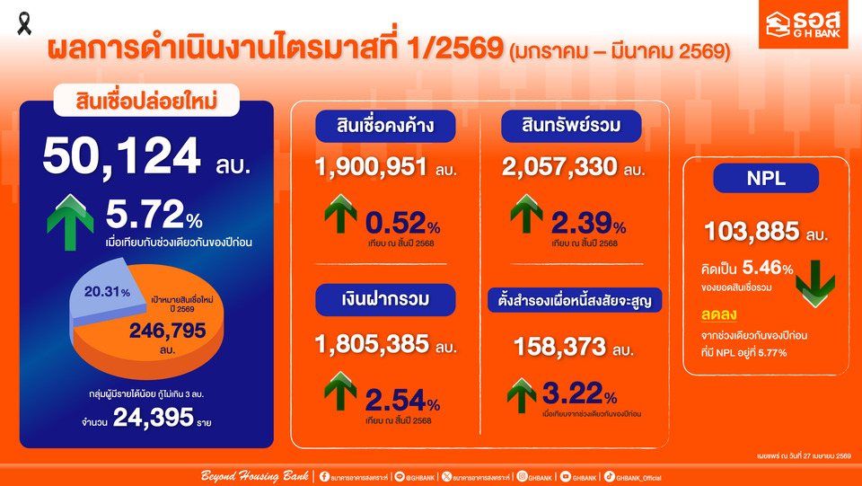 ธนาคารอาคารสงเคราะห์ (ธอส.) เผยผลการดำเนินงานไตรมาสที่ 1 ปี 2569 สามารถปล่อยสินเชื่อใหม่ ได้ 50,124 ล้านบาท ดันเม็ดเงินลงสู่ระบบเศรษฐกิจ ขับเคลื่อนภาคอสังหาริมทรัพย์ให้ฟื้นตัว สนับสนุนนโยบายรัฐบาลจัดทำสินเชื่อประหยัดพลังงาน พร้อมออกมาตรการดูแลลูกค้าอย่างต่อเนื่อง ด้วยอัตราดอกเบี้ยที่เหมาะสมและเงื่อนไขผ่อนปรน ให้กู้เพิ่มอัตราดอกเบี้ยเริ่มต้น 1% อีกทั้งยังช่วยรักษาบ้านให้คนไทยได้อย่างยั่งยืนผ่าน 5 Strategic Pillars โดยนำเทคโนโลยี Digital Data และ AI ยกระดับการให้บริการและพัฒนาองค์กรทุกมิติอย่างมีประสิทธิภาพ