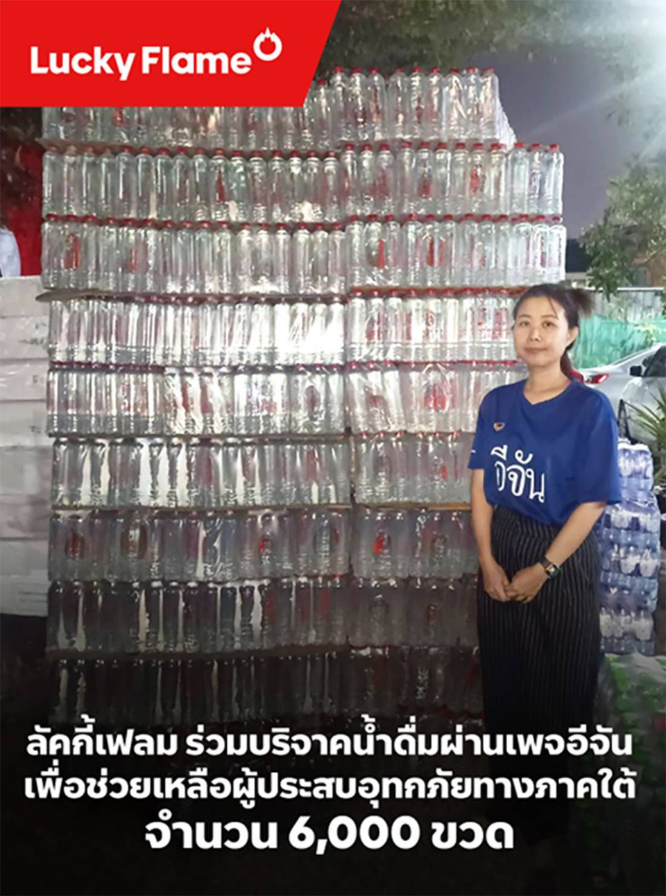 กิจกรรมที่ 2 ส่งต่อความช่วยเหลือเร่งด่วน ถึงมือผู้ประสบภัย เพื่อให้ความช่วยเหลือเข้าถึงพื้นที่ได้อย่างรวดเร็ว ลัคกี้เฟลม ร่วมกับ อีจัน ส่งมอบเตาแก๊สจำนวน 100 ชุด พร้อมน้ำดื่มรวม 60,000 ขวด ลงสู่ชุมชนในอำเภอหาดใหญ่ เติมทั้งพลังชีวิตและกำลังใจในช่วงเวลาวิกฤต