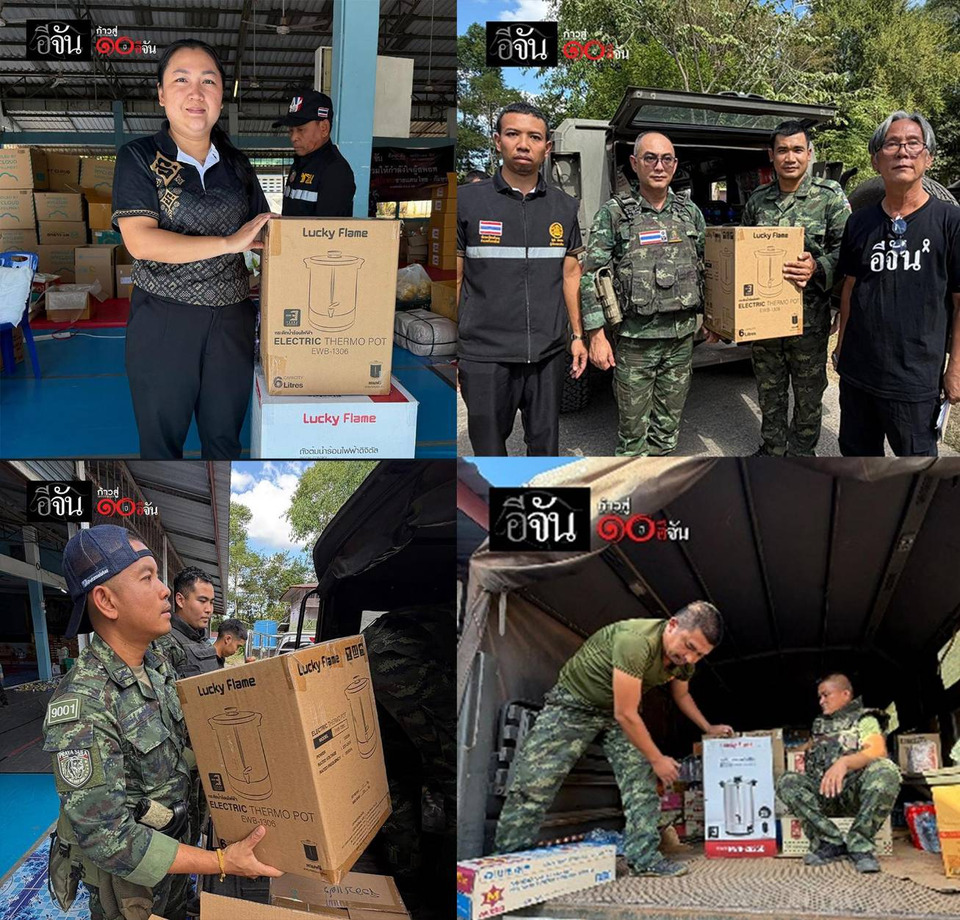 กิจกรรมที่ 4 ส่งต่อความอบอุ่น ดูแลคุณภาพชีวิตในศูนย์อพยพ อีกหนึ่งการส่งต่อ “ลัค” ที่สำคัญ คือการดูแลชีวิตประจำวันของผู้อพยพ ลัคกี้เฟลม มอบถังต้มน้ำร้อนจำนวน 120 ชุด ผ่าน อีจัน เพื่อสนับสนุนศูนย์อพยพในพื้นที่ชายแดนไทย–กัมพูชา และศูนย์พักพิงในอำเภอหาดใหญ่ เติมความอบอุ่นและความปลอดภัยในช่วงเวลาที่ยากลำบาก