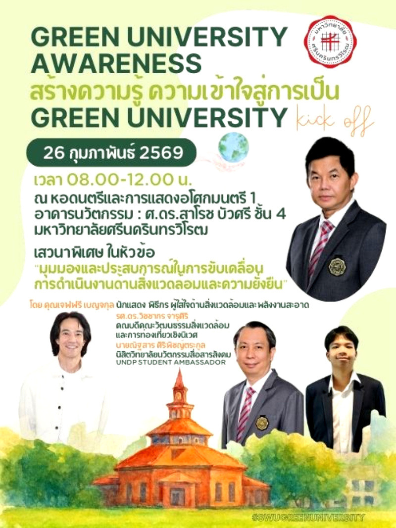 มหาวิทยาลัยศรีนครินทรวิโรฒ (มศว) มหาวิทยาลัยเพื่อสังคมยุคใหม่ใส่ใจสิ่งแวดล้อม ในแนวนโยบาย L O V E S ซึ่ง E ( Environment ) สื่อถึงการสร้างความรู้ ความเข้าใจสู่การเป็น Green University Awareness หรือ มหาวิทยาลัยสีเขียว (Green University) และปรับภูมิทัศน์ให้มหาวิทยาลัยเป็น Universal Design รวมถึง Health and Well- being areas เพื่อสุขภาวะที่ดีของคนในสังคมชุมชนโดยรอบ เช่น อโศกโมเดล – องครักษ์โมเดล เป็นต้น โดยล่าสุด มศว จะจัดโครงการ Green University Awareness : สร้างความรู้ความเข้าใจสู่การเป็น Green University (Kick Off) ในวันที่ 26 กุมภาพันธ์ 2569 เวลา 08.00-12.00 น. ณ หอดนตรีและการแสดงอโศกมนตรี 1 อาคารนวัตกรรม : ศ.ดร.สาโรช บัวศรี มศว ประสานมิตร กทม. เพื่อขับเคลื่อนนโยบายมหาวิทยาลัยสีเขียวอย่างเป็นรูปธรรม สร้างความตระหนักรู้ด้านสิ่งแวดล้อมแก่ประชาคมภายในและภายนอก โดยเปิดโอกาสให้บุคคลภายนอกที่สนใจเข้ารับฟังการเสวนาได้ฟรีโดยไม่มีค่าใช้จ่าย
