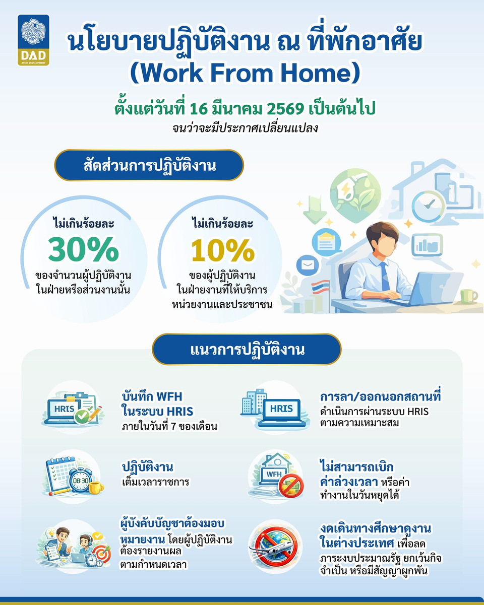 พร้อมกันนี้ DAD ยังเดินหน้ามาตรการลดการใช้น้ำมันเชื้อเพลิง ใช้รถยนต์เท่าที่จำเป็น สร้างนิสัยการเดินทางร่วมกัน การใช้ระบบขนส่งสาธารณะ การประชุมผ่านระบบ Video Conference และการปฏิบัติงานแบบ Work From Home ตั้งแต่วันที่ 16 มีนาคม 2569 เป็นต้นไป ตามความเหมาะสม โดยไม่กระทบต่อการให้บริการ ซึ่งกำหนดสัดส่วน WFH สำหรับงานทั่วไปที่ร้อยละ 30 ของอัตรากำลังทั้งหมด และร้อยละ 10 สำหรับงานด้านบริการ มาตรการดังกล่าวสะท้อนความมุ่งมั่นของ DAD ในการบริหารจัดการองค์กรอย่างมีประสิทธิภาพ ควบคู่การสนับสนุนนโยบายรัฐด้านการอนุรักษ์พลังงาน และการพัฒนาองค์กรสู่ความเป็นมิตรต่อสิ่งแวดล้อมอย่างยั่งยืน