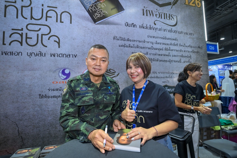 หนึ่งในไฮไลต์สำคัญของงานอยู่ที่บูทสำนักพิมพ์ทัพอักษรา (I26) ซึ่งมีแฟนคลับจำนวนมากเข้าร่วมกิจกรรมเปิดตัวหนังสือ “ชีวิตที่ไม่คิดเสียใจ” ผลงานเล่มแรกของ “พลเอก บุญสิน พาดกลาง” หรือ “แม่ทัพกุ้ง” ที่ถ่ายทอดประสบการณ์ชีวิต มุมมองความคิด และบทเรียนแห่งความมุ่งมั่นของผู้นำทหารไทยอย่างเข้มข้น โดยมีผู้อ่านต่อคิวขอลายเซ็นและร่วมพบปะอย่างล้นหลาม สร้างบรรยากาศอบอุ่นและคึกคักตลอดทั้งวัน