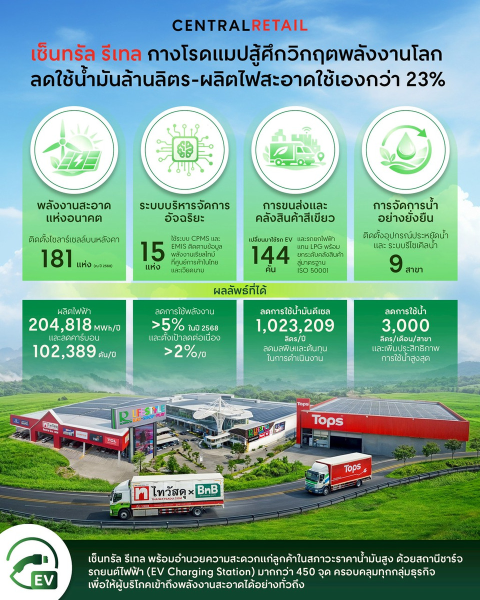 เซ็นทรัล รีเทล เดินหน้าโรดแมปรับมือวิกฤตพลังงานโลก ลดการใช้น้ำมันกว่า 1 ล้านลิตรต่อปี พร้อมผลิตไฟฟ้าสะอาดใช้เอง 23% ผ่านโซลาร์เซลล์กว่า 181 แห่ง ระบบ EV และพลังงานอัจฉริยะ ควบคู่ดูแลลูกค้า คู่ค้า และลดค่าครองชีพอย่างยั่งยืนทั่วประเทศ