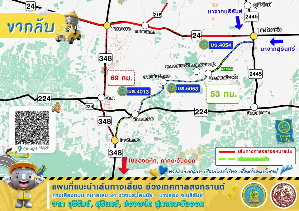 นอกจากนี้ ทช. ยังได้ดำเนินการติดตั้งป้ายเตือน ป้ายแนะนำเส้นทางเลี่ยงตามโครงข่ายทางหลวงชนบท เพื่ออำนวยความสะดวกปลอดภัยในการเดินทางให้กับประชาชน ทั้งนี้ หากต้องการความช่วยเหลือหรือสอบถามข้อมูลเพิ่มเติมติดต่อได้ที่เจ้าหน้าที่แขวงทางหลวงชนบทในพื้นที่ หรือสายด่วน ทช. โทร. 1146