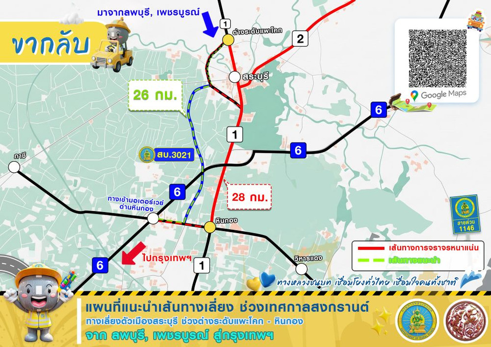 - เส้นทางเลี่ยง ทล.1 (ถนนพหลโยธิน) เริ่มจาก ทล.1 กม.ที่ 112+200 (ต่างระดับแพะโคก) เลี้ยวขวาเข้าสู่ ทล.362 (ถนนเลี่ยงเมืองสระบุรี) เดินทางต่อเป็นระยะทาง 7.9 กิโลเมตร จนถึงคลองชลประทาน กม.ที่ 3+750 เลี้ยวขวาเข้าสู่ทางหลวงชนบทสาย สบ.3021 เดินทางต่อเป็นระยะทาง 14.8 กิโลเมตร เลี้ยวขวาเข้าสู่ ทล.33 (แยกร่องแซง) เดินทางต่อเป็นระยะทาง 4 กิโลเมตร จนถึงทางเข้ามอเตอเวย์ M6 ด่านหินกอง เพื่อมุ่งหน้ากรุงเทพฯ ต่อไป