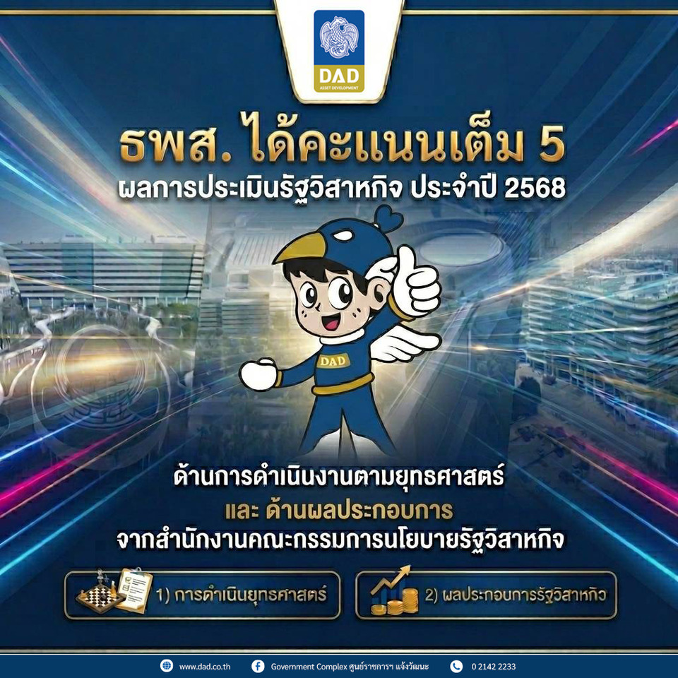 วันที่ 24 เมษายน 2569 ดร.ธีธัช สุขสะอาด รักษาการ กรรมการผู้จัดการ DAD เปิดเผยว่า ผลการประเมินดังกล่าวสะท้อนถึงความสำเร็จในการขับเคลื่อนองค์กรตามยุทธศาสตร์อย่างมีประสิทธิภาพ โดยมีเพียง 2 รัฐวิสาหกิจ จากทั้งหมด 52 แห่ง ที่ได้รับคะแนนเต็มในทั้งสองหัวข้อ ได้แก่ DAD และธนาคารอาคารสงเคราะห์ ขณะที่คะแนนรวมทั้งระบบอยู่ที่ 4.2298 จากการประเมิน 3 ด้านหลัก ได้แก่ การดำเนินงานตามยุทธศาสตร์ ผลการดำเนินงาน และการบริหารจัดการองค์กร (Core Business Enablers) ความสำเร็จดังกล่าวสอดคล้องกับผลการดำเนินงานที่เป็นรูปธรรม โดยในปี 2568 DAD ได้ส่งมอบพื้นที่สำนักงานภายในศูนย์ราชการเฉลิมพระเกียรติฯ อาคาร C ให้กับหน่วยงานภาครัฐเข้าใช้พื้นที่ จำนวน 17 หน่วยงาน พื้นที่กว่า 510,000 ตารางเมตร ซึ่งถือเป็นหมุดหมายสำคัญของการพัฒนาโครงสร้างพื้นฐานภาครัฐสมัยใหม่